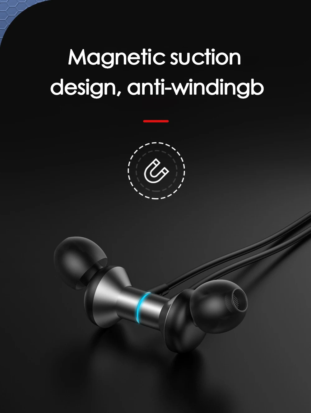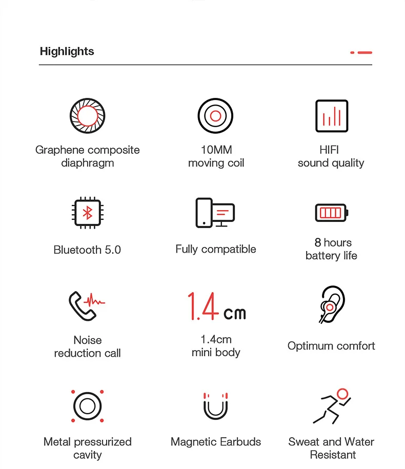 Product parameters Tech specs General ●In Ear Connections and expansion ●Bluetooth ●Wireless Power ●Rechargeable Lithium-ion Other features ●With remote and mic ●Inline call and music controls ●Inline volume control ●Noise Isolation ●Memory cable Graphene composite diaphragm 10mm moving coil HIFI sound quality Bluetooth 5.0 Fully compatible 8 hours battery life Noise reduction call Optimum comfort Metal pressurized cavity Magnetic Earbuds Sweat and Water Resistant