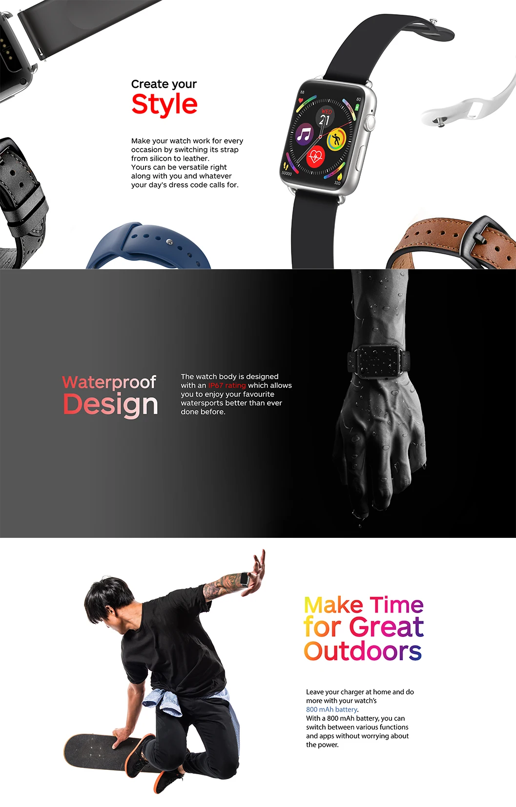 О:Шагомер, расстояние, калории, пульс, запись истории, уведомления; В режиме длительного ожидания экран неэффективен, короткое нажатие кнопки назад для активации экрана.