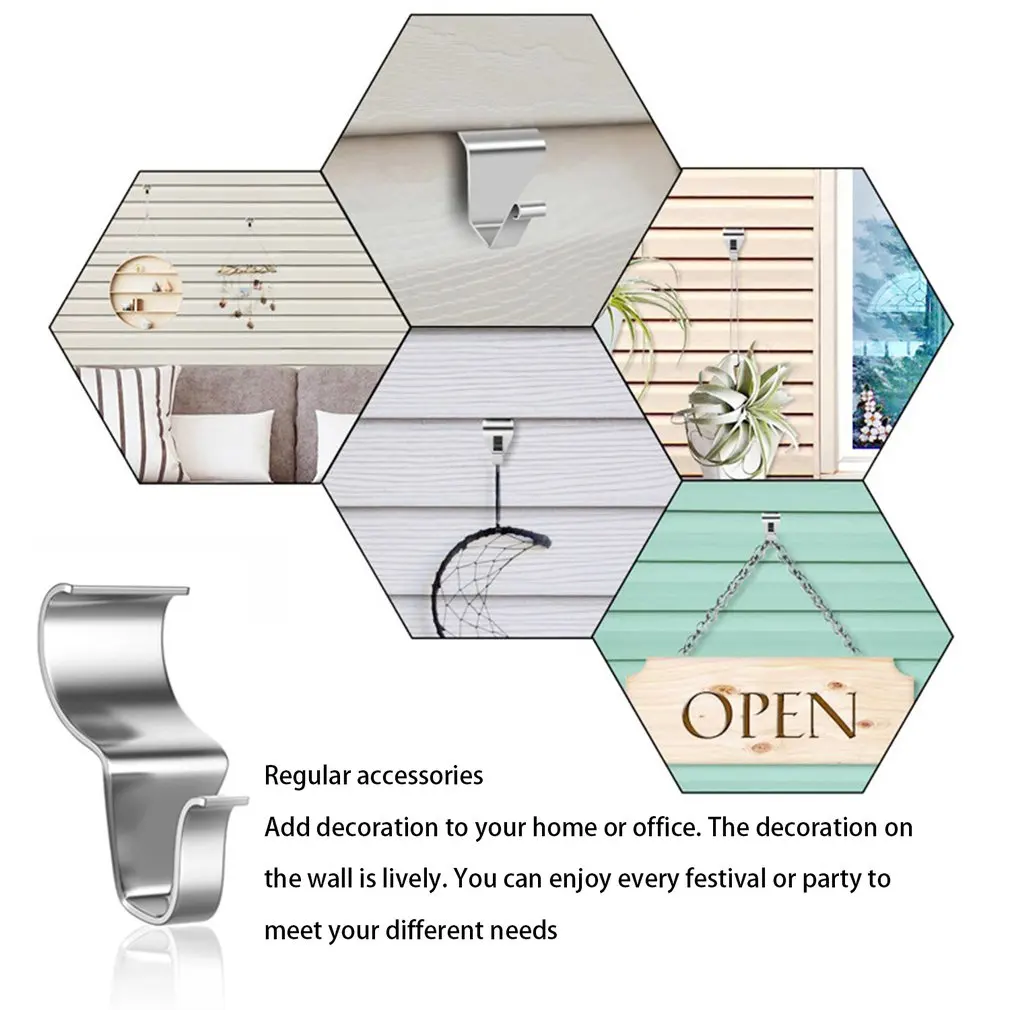 Особенности: 1. Не нужно пробивать: не нужно пробивать клей, простая установка, легко разбирать и перемещать. 2. Слегка изогнутый дизайн: его легко свернуть в виниловый сайдинг и любые швы, которые соединяют боковые рельсы. 3. Дизайн пряжки: пряжка пряжки следующий слой из винила, стеновая панель, и является более стабильным. 4. Мощная конструкция крюка: Интегрированная мощная конструкция крюка, эффективный Подшипник нагрузки 2 кг без деформации. Описание: Этот крючок не ржавеет, деформируется, прочный, легко разбирается и перемещается, подходит для домашнего или другого назначения. Характеристики: Материал: нержавеющая сталь 430 Размер: 4 см * 2 см Вес нетто: 6 г/шт. Посылка включает в себя: 8/ 10 /12 шт * крючок (опционально)