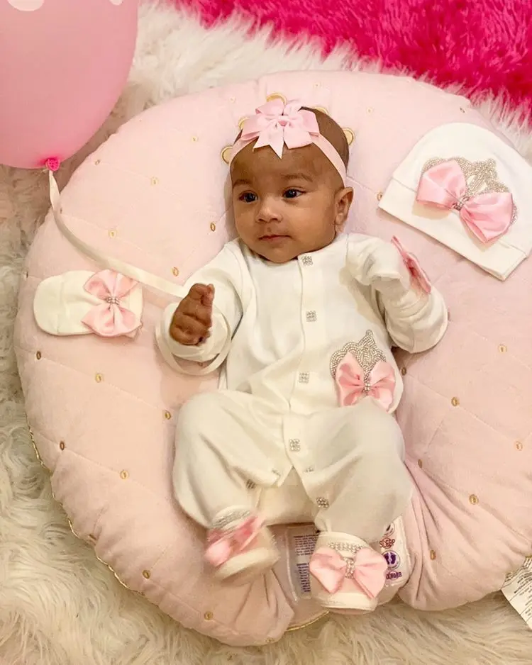 В комплект входит: Украшенные Стразами Кружевные гольфы, шапка и варежки с бантом