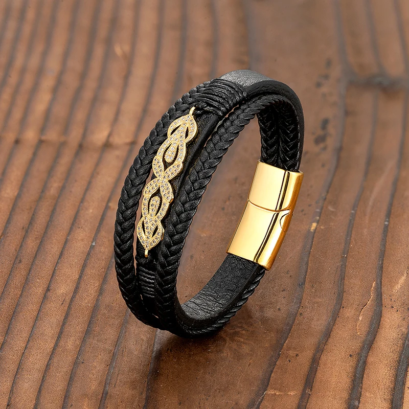 Новый золотой микро-инкрустированный Алмазный полый поляризационный кожаный браслет из нержавеющей стали 316 в нейтральном стиле
