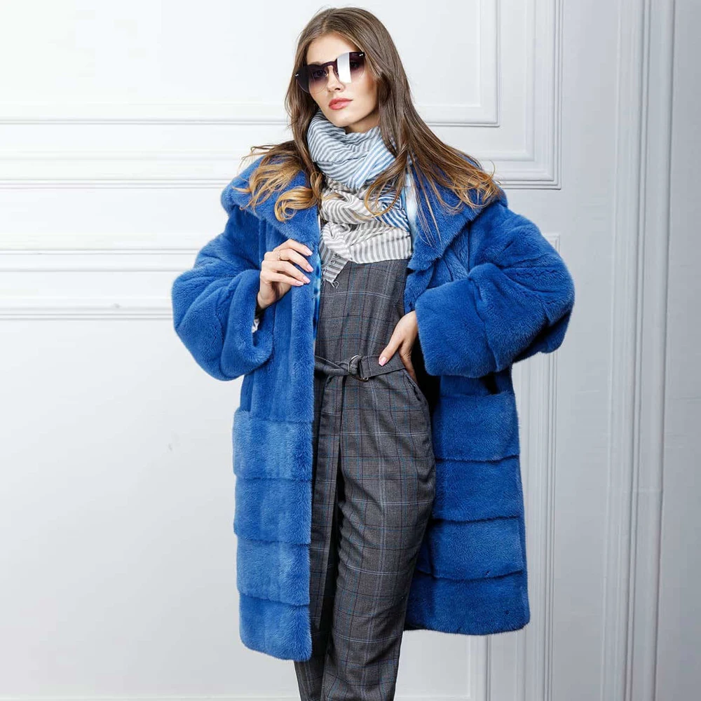 Длинная шуба из натурального меха норки 120 см с большим капюшоном модная