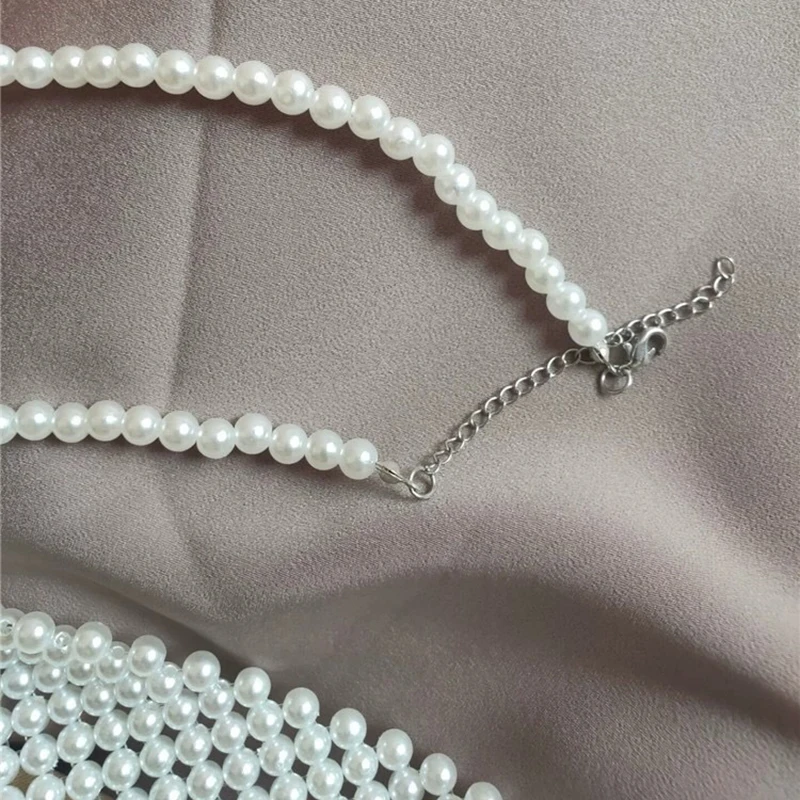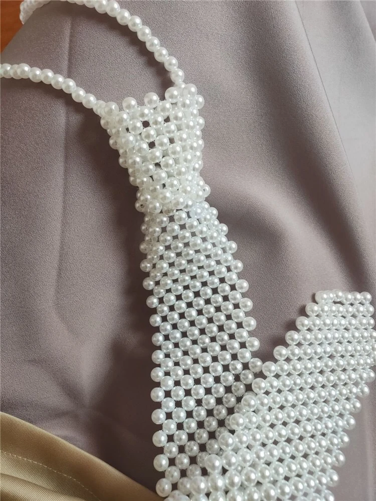 Vintage Women Pearl Bow Tie Handmade Beaded Bib Jewelry Clothes Shirt hollow-out False Collar Pearl Tie Jewelry