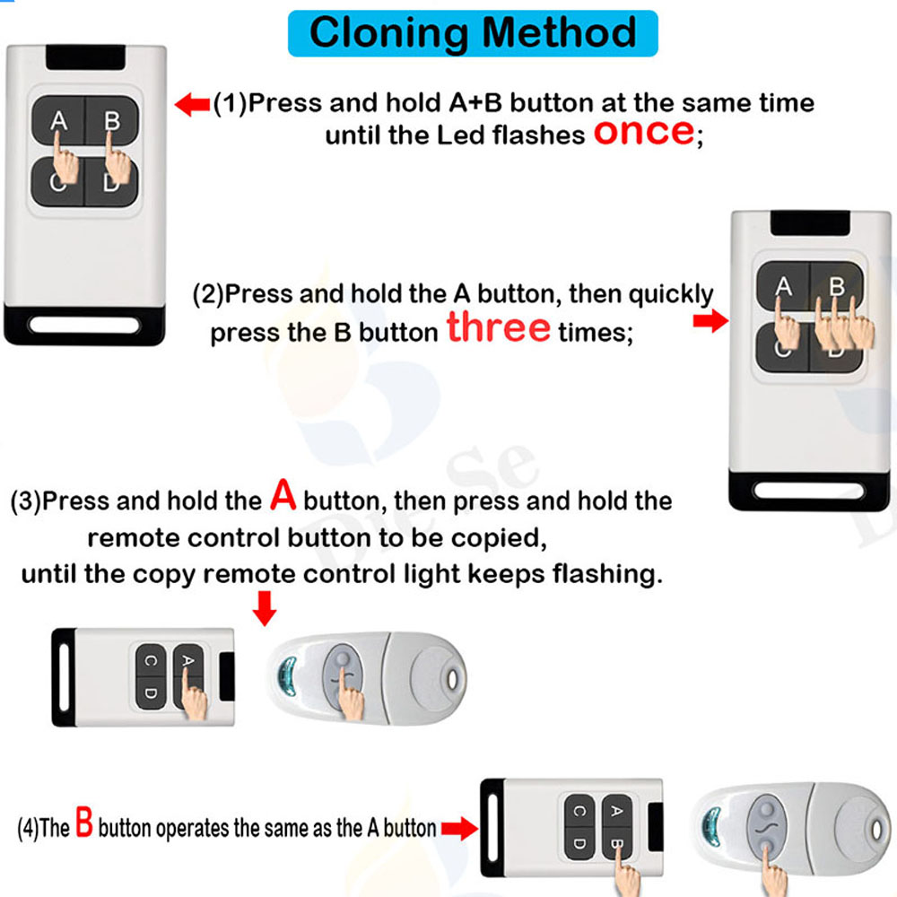 2. Нажмите и удерживайте кнопку A оригинального передатчика, затем нажмите и удерживайте кнопку A дубликатора, пока не увидите светодиодный фонарик дубликатора