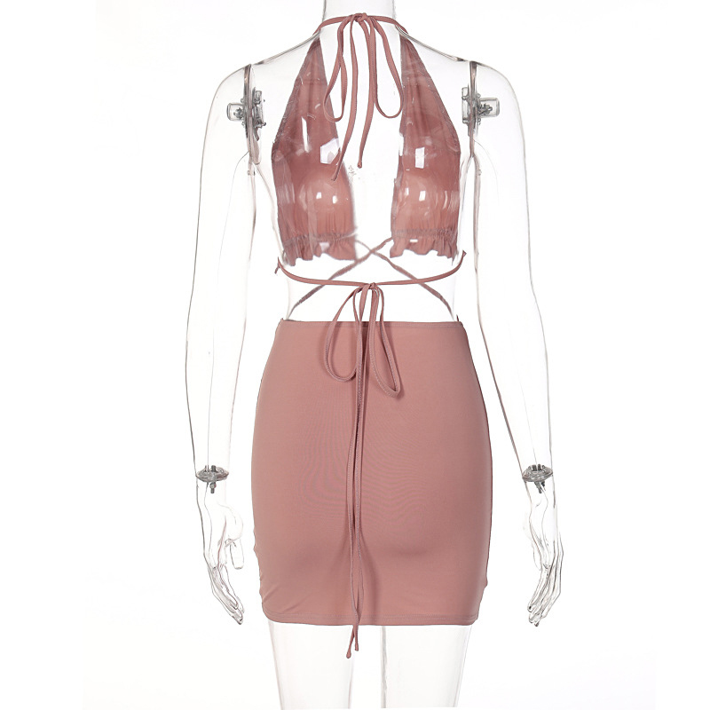 Женский облегающий комплект из двух предметов: топ с открытой спиной и юбка на бедрах. Юбка с высокой талией.