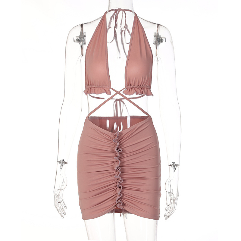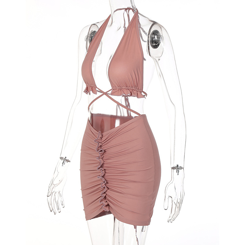 Женский комплект из 2 предметов с юбкой, однотонная укороченная майка с завязками на шее + короткая юбка с высокой талией и рюшами на бедрах, женская одежда для бара/вечерние/Клубные костюмы