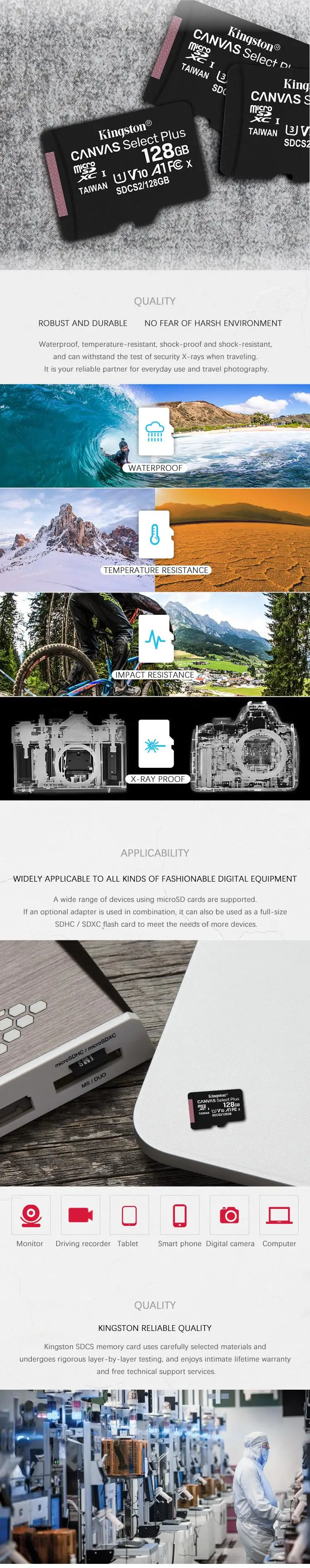 Мы обещаем только продажу100% оригинальная micro-карта памяти kingston!Kingston Canvas Select Plus microSD совместим с устройствами Android и разработан с номинальной производительностью A1. Он обеспечивает улучшенную скорость и емкость для более быстрой загрузки приложений и съемки изображений и видео в нескольких емкостях до 512GB1. Мощный по производительности, скорости и долговечности, Canvas Select Plus microSD разработан для надежности при съемке и разработке фотографий с высоким разрешением или съемке и редактировании видео full HD. Холщовые карты Kingston прошли проверку на долговечность в самых суровых условиях и условиях, поэтому вы можете брать их с собой куда угодно, с уверенностью, что ваши фотографии, видео и файлы будут защищены. Доступен с пожизненной гарантией.