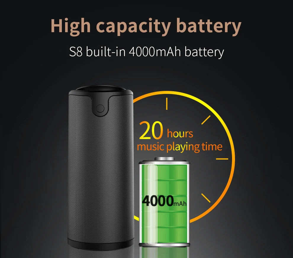 Особенности: 1. Функция сенсорного управления 2. Может использоваться как внешний аккумулятор 3. Поддержка micro SD карты воспроизведения музыки 4. 3D HiFi стерео 5. Время воспроизведения музыки: 20 часов 6. Размеры: 17 см x 7,2 см x 7,2 см 7. Вес: 423 г 8. Совместимость с: Iphone, Android телефонами, такими как Samsung,ZTE и так далее, ПК Посылка список: 1 х Zealot S8 bluetooth динамик Для переноски-1 шт. чехол 1 х usb кабель для зарядки 1 х аудиокабель 1 х Карабин Руководство по эксплуатации на английском языке-1 шт.