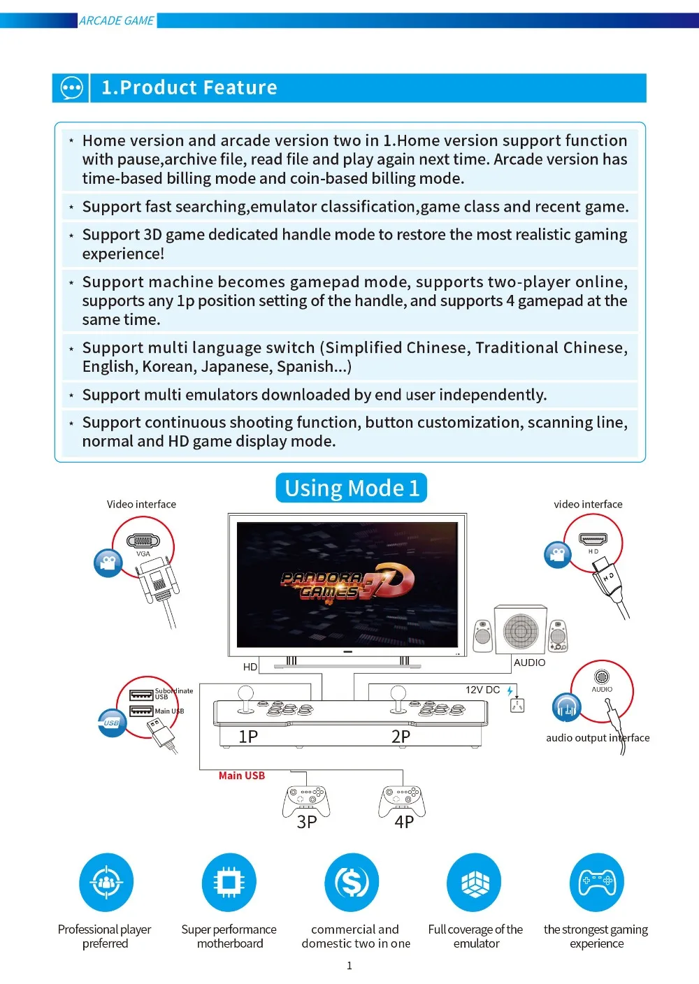 1. Ручка контроллера аркады2. Кабель HDMI3.USB кабель4. Адаптер питания5. Кабель питания (вилка EU/GB/US/UK)6. Аксессуары для подарочных кнопокСтиль 1, стиль 2 не имеет кнопок на светильник.7750 * 2D игры + 250 * 3D игрыПоддержка загрузки игр через WiFi 500 разПоддержка загрузки других игр, не каждая дополнительная Загрузка игры может быть воспроизведена хорошо.Для международных покупателей; В связи с тем, что в разных странах действуют различные правила таможенного налога, все таможенные пошлины будут покрываться покупателемПожалуйста, не стесняйтесь связаться со мной, если вам нужен список игрСмотрите так же другие товары: