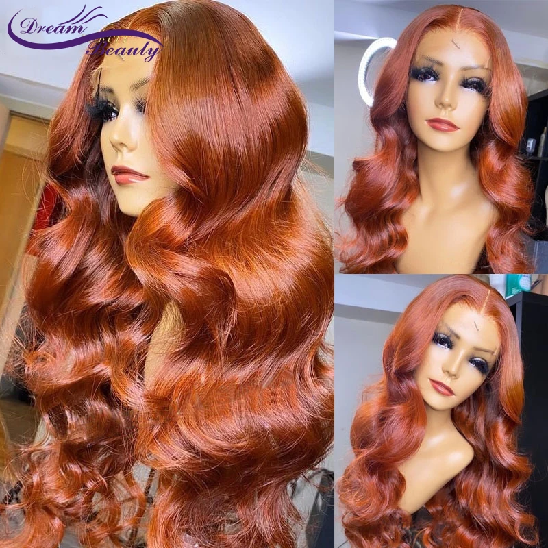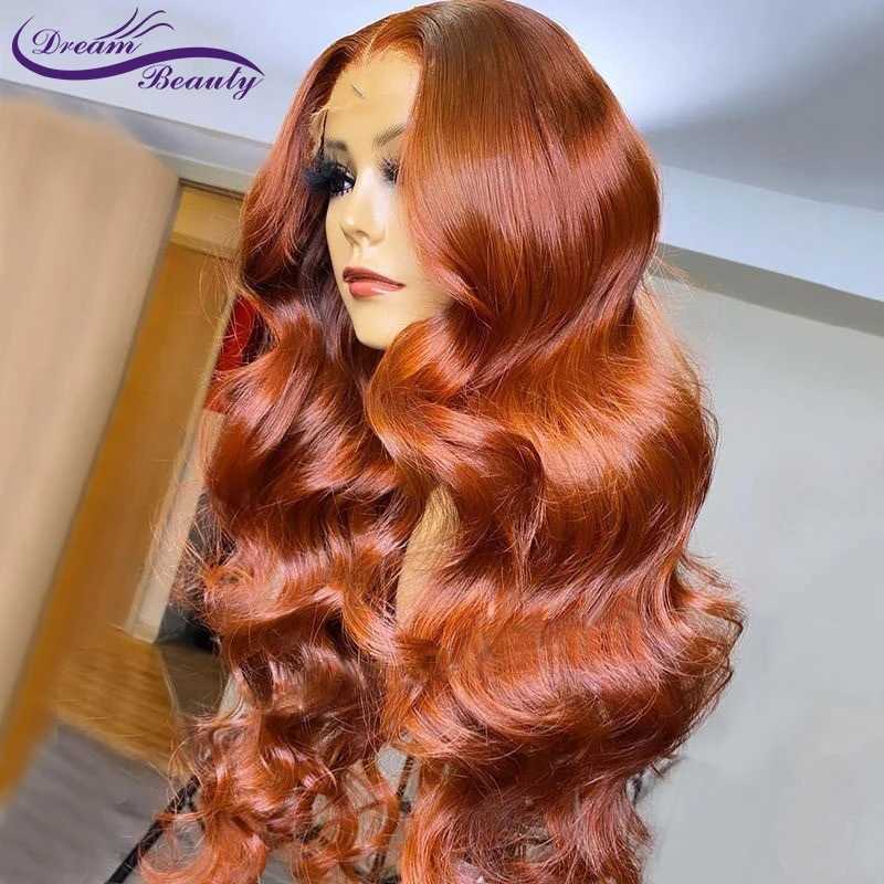 Парики оранжевого цвета, кружевные передние человеческие волосы, волнистые бразильские парики имбирного цвета, кружевные парики, отбеленные узлы, мечта красоты