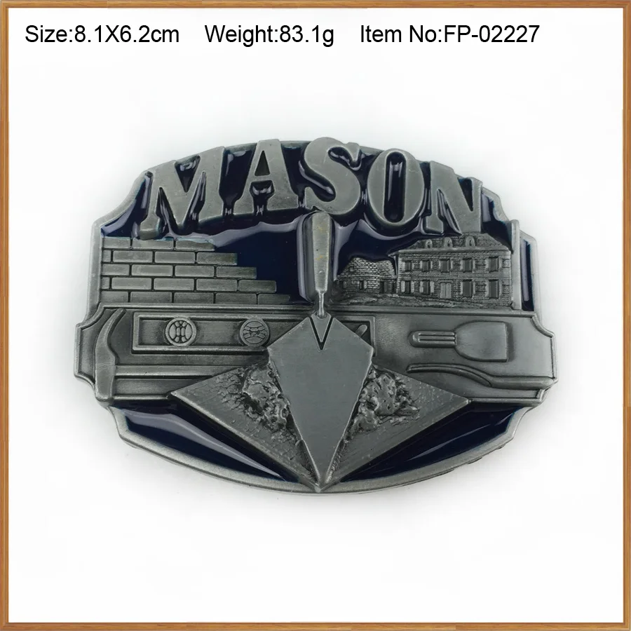 Product description: Blue enameled mason belt buckle with pewter finish
