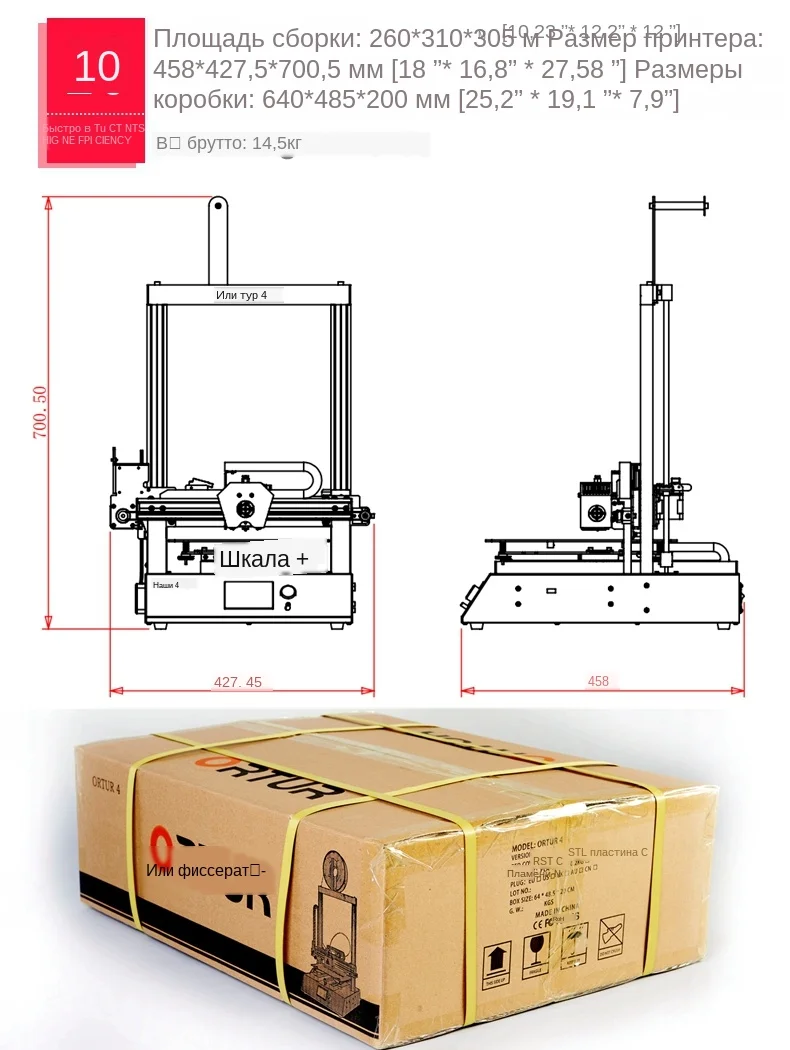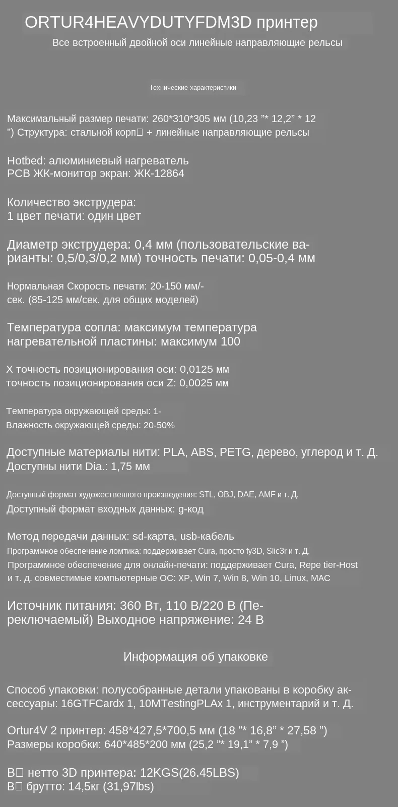 Максимальный размер печати:260*310*305 мм (10,23 "* 12,2" * 12 ") Материал оправы: стальной корпус + промышленная линейная направляющая ЖК-экран: LCD12864 Количество экструдера: 1 Диаметр экструдера. : 0,4 мм (пользовательские варианты: 0,5/0,3/0,2 мм) Разрешение слоя: 0,1 мм Нормальная Скорость печати: 100-150 мм/сек. (При простой форме поверните по часовой стрелке 100-300% для ускорения.) Температура сопла: максимум 275 ℃ Температура нагрева: максимум 100 ℃ Источник питания: 360 Вт, 110 В/220 В (Переключаемый) Размеры 3D-принтера: V1: 458*422*716,5 мм (18 "* 16,6" * 28,2 ") V2: 458*427,5*710,5 мм (18 "* 16,8" * 28 ") Размеры коробки: 640*485*200 мм (25,2 "* 19,1" * 7,9 ") Вес брутто: 14,5кг (31,97lbs) Особенности:1.Прочная металлическая рама: Принимает профессиональную структуру листового металла, уменьшает резонанс и поддерживает высокую точность.
