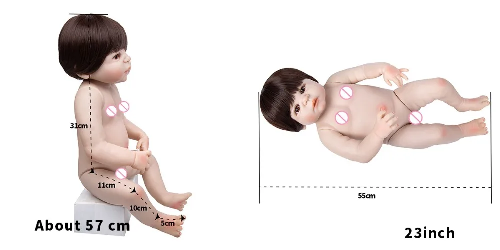 Материал: Полностью силиконовый винил, импортный мягкий винил из Германии, 100% безопасный и Удобные. Размеры:23 дюйма около 57 см Глаза:Акриловые глаза, синий или коричневый можно выбрать Кожа: Белая кожа является самым уникальным местом для этой куклы, дизайнеры проведут Много времени на то, чтобы кожа ребенка выглядела более реалистичной многослойной. Волосы: Высококачественный приклеенный парик для коричневого цвета; Светильник Аксессуары для куклы: В посылке: кукла + Одежда для кукол + сертификат рождения + мини-плюшевая игрушка (отправляется случайным образом) . Кукольная структура: Голова, конечности изготовлены из силиконового винила. Импортные мягкие виниловые сырье Производство материала, нетоксичный; Кукольные конечности могут быть активными, они могут сидеть или лежать, Силиконовая виниловая кукла может войти в воду, не может стоять, говорить или питаться.Это все наше Кукольное шоу: