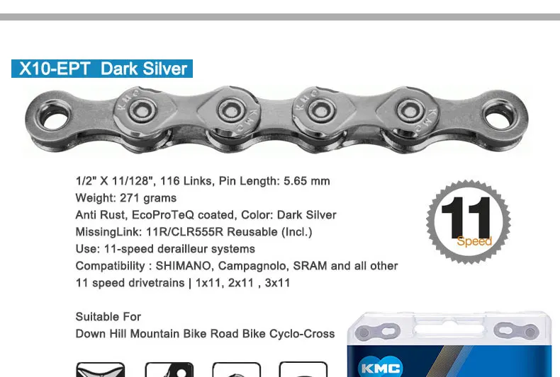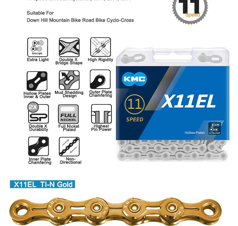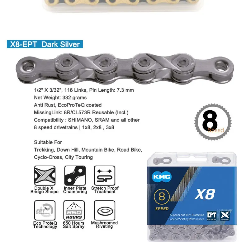 Цепь серии KMC X, кредитная с хорошо сделанным, прочным использованием и стабильной производительностью, обладает широкой яростью, чтобы покрыть все потребности в велосипедах от треккинга до гонок.