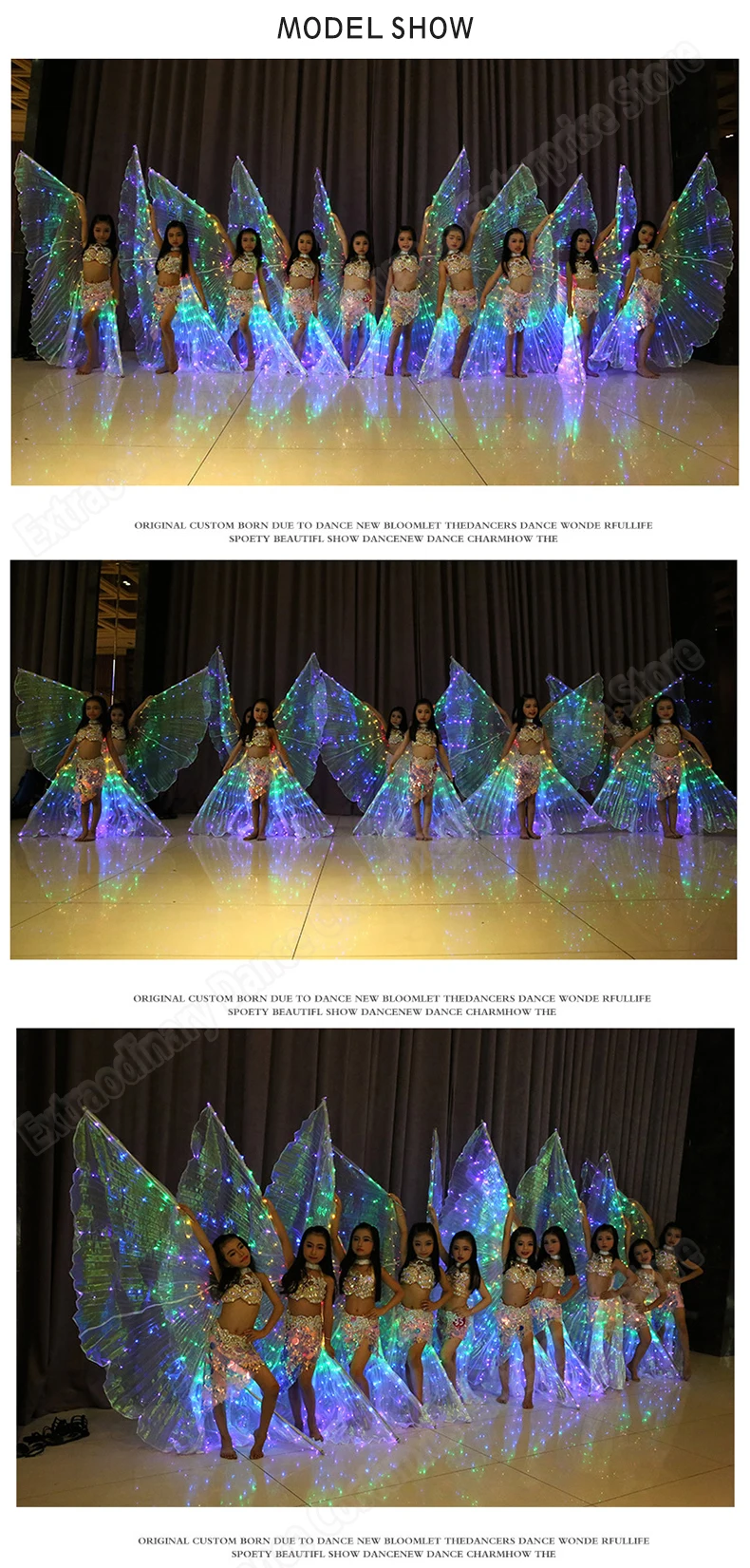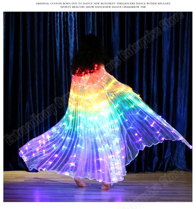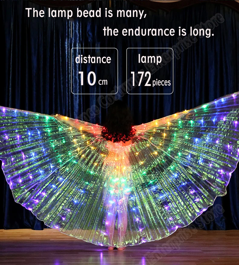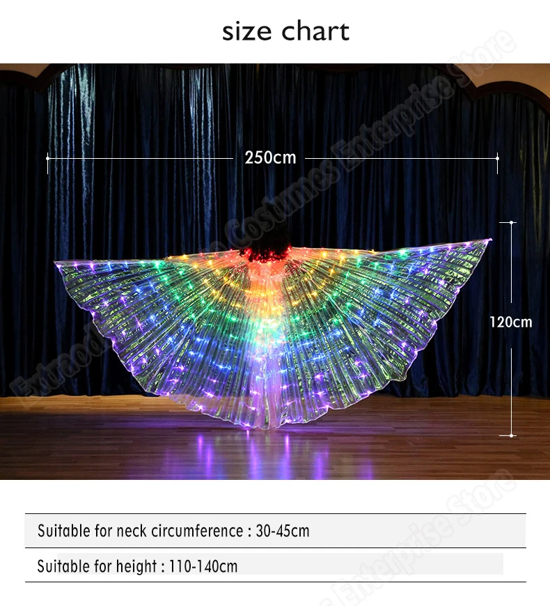 1. Цвет крыльев: разноцветный. 2. Длина: 120 см; Расправить крылья: 250 см; 3. Размер модала для девочек: рост 126 см, вес 22 кг. 4. Функции: светодиодный фонарик Isis Wings, яркий, волшебный, может сделать вашу производительность очень волшебной и ослепленной. Светильник с крыльями имеет 1 режим. 5. Применение: Идеально подходит для живота Танцы, шоу, годовой костюмированного Рейв, карнавал, сцены, Хэллоуин, вечерние, рождественские наряды, фон для фотосъемки, для костюмированной вечеринки. 6. Вы получите: 1 * Светодиодный крылья isis + 2 шт. регулируемой ручки, и вам нужно подготовить 3 шт. батареи 3AA. 7. Все лампы: 172 шт. 8. Режим: 1 режим.