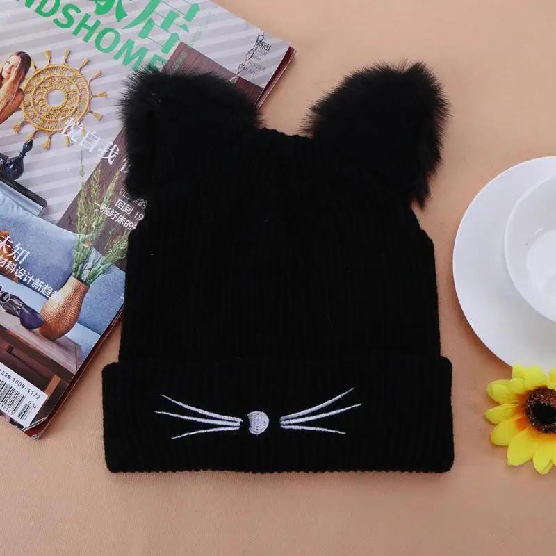 Милая женская зимняя Черная шапка в рубчик с двумя меховыми кошачьими ушками, акриловая вязаная шапка
