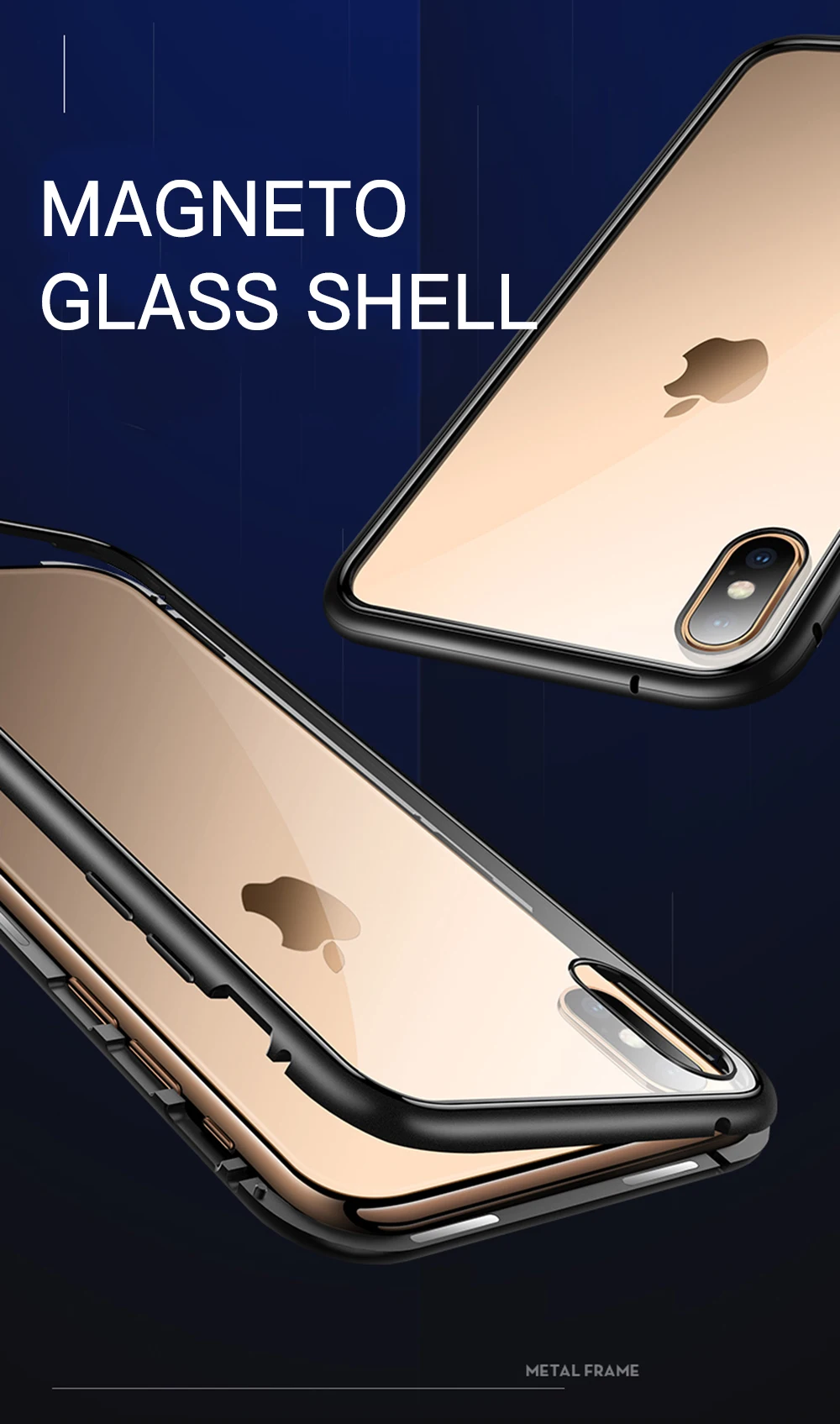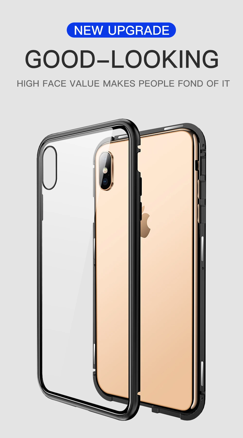 New 360 Double Sided Magnetic Adsorption Phone Case Metal Magnet Tempered Glass Case. 1.The multipoint and durable built-in magnetic adsorption technology makes the case seamless and always easy to take out of your iPhone. 2.9H tempered glass back cove?The back is made of high quality tempered glass to show the luxurious look of your phone. 3.Full body metal frame The combination of metal front and metal rear,protection from drops, bumps, scratches.