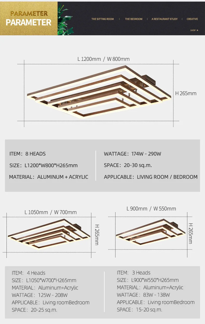 ● 100% новый бренд. ● Размер: 3 головки L900 * W550 * H265mm 83w-138w 4 головки L1050 * W700 * H265mm 125w-208w 5 головок L1200 * W800 * H265mm 174w-290w ● Основные материалы: алюминий + акрил ● Напряжение: 85-265 в ● Пульт дистанционного управления: Да (только с регулируемой яркостью RC) ● Диммирование: Да (только Диммируемый RC) ● Средняя продолжительность жизни: 50000 ч ● Тип источника света: светодиодный чип ● Источник света включен или нет: Да ● Диммируемый RC: не только 3 светильник, теплый белый и естественный белый и холодный белый, но и возможность затемнения яркости