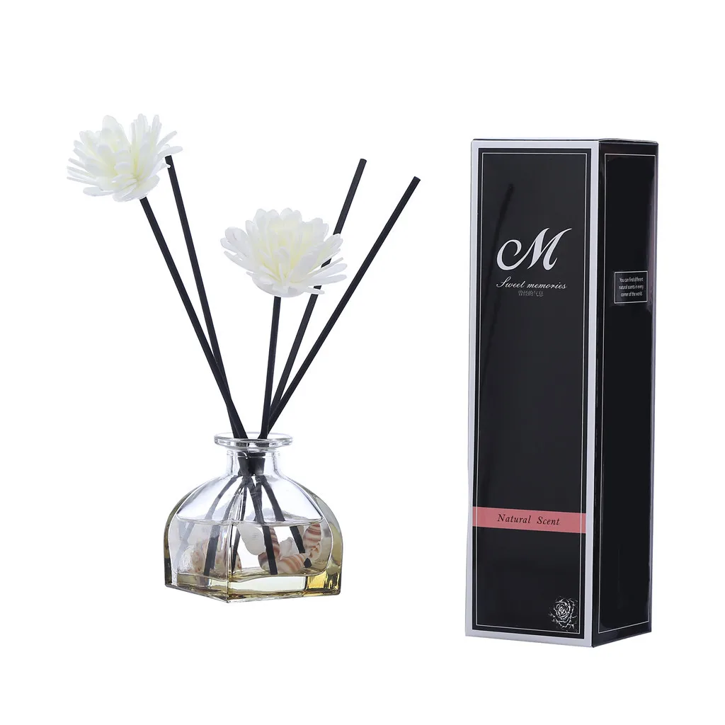 COMPLETE REED DIFFUSER SET. Includes 60ML of premium quality fragrance oil, 3 rattan volatile sticks + 2 chrysanthemums and a stylish refillable glass bottle.