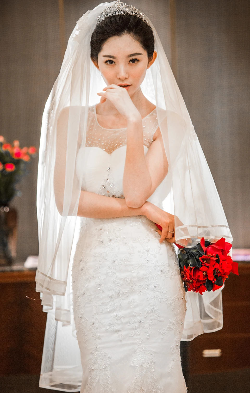Короткая Однослойная свадебная фата с жемчугом и бусинами Обложка для лица цвета