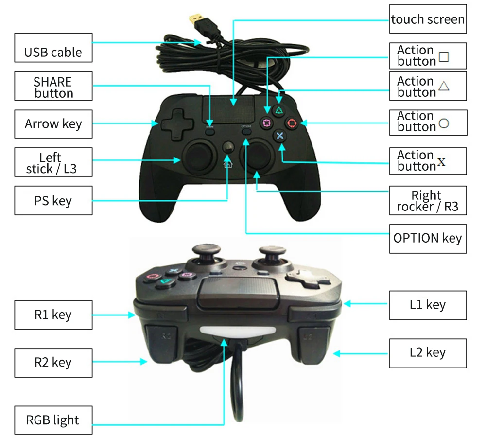 Шаги по использованию PS4: Включите хост (Эта ручка не включает функцию загрузки хоста), вставьте usb-разъем ручки в usb-порт хоста, И нажмите кнопку PS на ручке. В соответствии с инструкцией экрана выберите соответствующую учетную запись, которую вы хотите использовать, и установка этой ручки завершена;