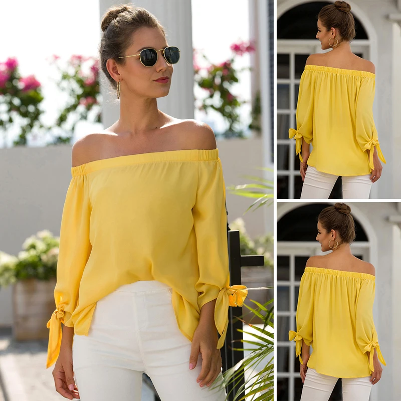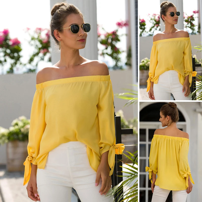 *Item Description:Women Tops Blouse Summer Off Shoulder Long Sleeve Bow-Knot Solid Color Fashion