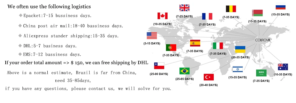 Когда товар отправляется?Обычно мы отправляем в течение 1 дня после получения платежа, при особом состоянии 2-3 дня,Если товар распродан, мы отправим вам сообщение в течение 1-2 дней.Как получитьБесплатная быстрая доставка?Если общая сумма заказа> $150,Мы отправимDHL бесплатно. Вы можете получить упаковку вОколо 5-7 дней.Если вы не хотите отправлять Экспресс-доставку,Пожалуйста, обратите внимание в заказе ниже или оставьте сообщение, чтобы сообщить нам.