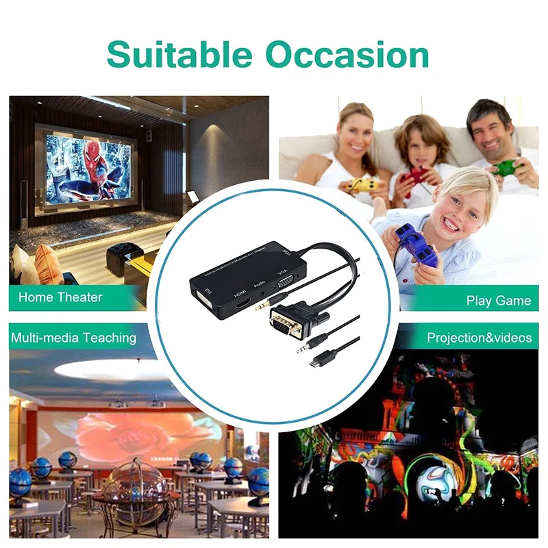 1. Многопортовый видео-и аудиоконвертер VGA:Этот 3в1 VGA к VGA HDMI DVI конвертер обеспечивает подключение от вашего VGA (15Pin) ввода ноутбуков, настольных компьютеров, видеокарты VGA к вашим большим внешним HDMI или VGA или DVI дисплеям (включая ТВ, проекторы и мониторы) через отдельно HDMI или VGA или DVI кабель, кабели нужны, но не включены в нашу посылка