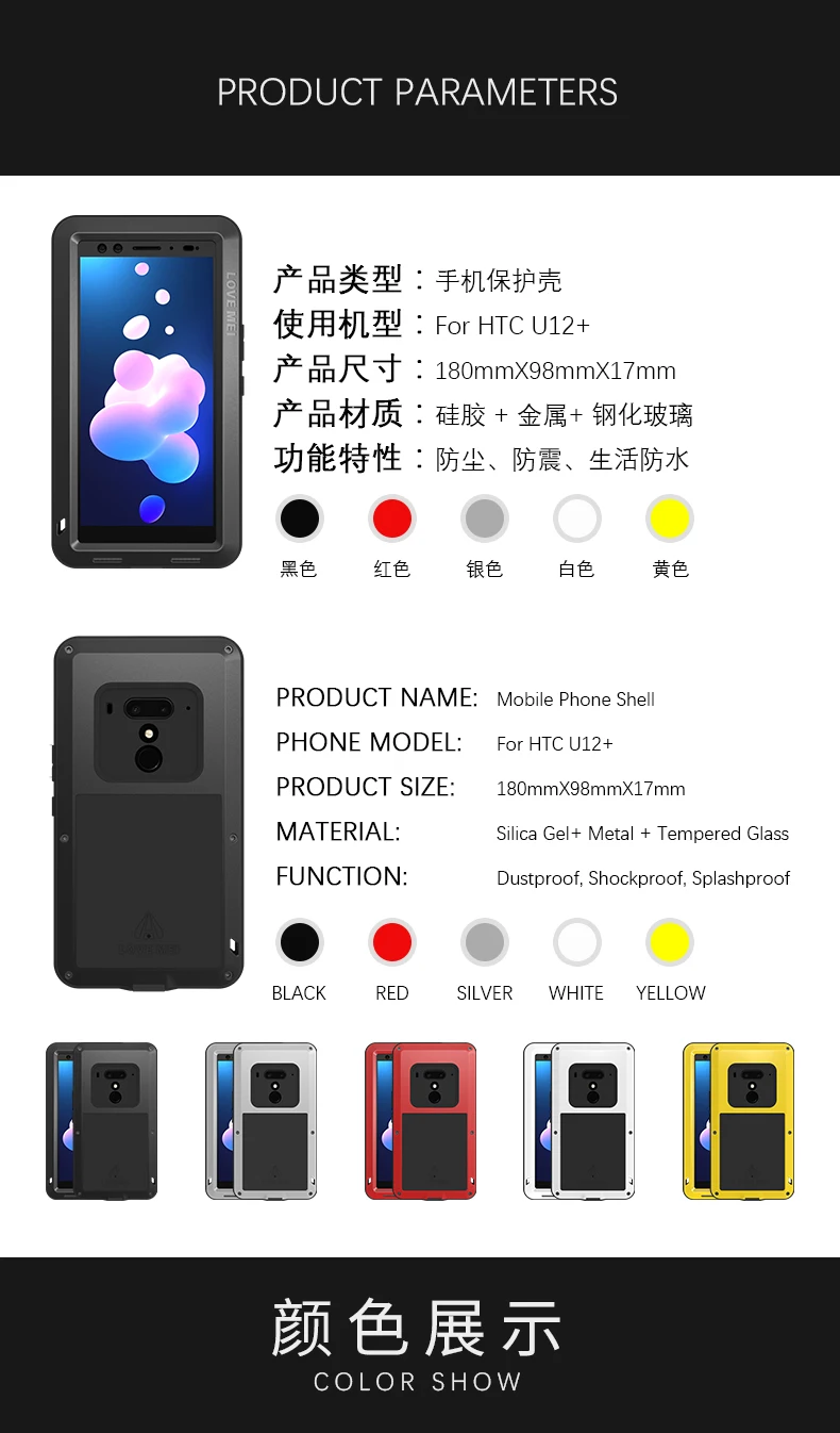 Description: 1. Quatity: 100% Original, high quality 2. Model: Perfectly fits for HTC U12+ 3. Function: Great protection from dirt, scratch and damages 4. Feature: Original Brand Waterproof Shockproof Aluminum Case Cover for htc u12 plus 5. Service: Real Free Ship + Fast Shipment + Quick Response + Do Customized Design 6. Drop ship support !! Wholesale big discount support !