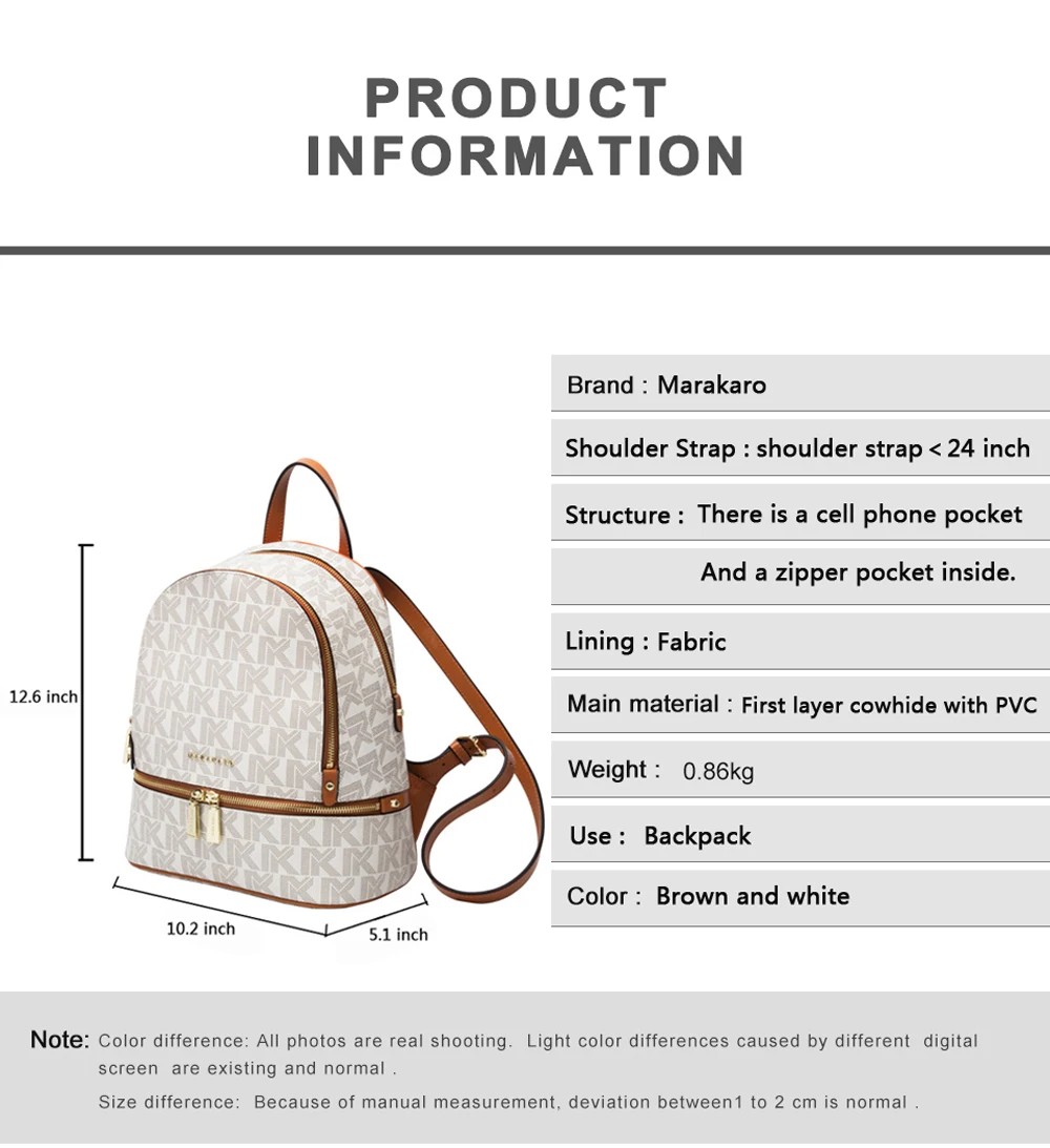 Бренд ------------------- Marakaro Плечевой ремень ---- плечевой ремень <24 дюйма Структура ------------ есть карман для мобильного телефона И внутренний карман на молнии Подкладка ------------------ ткань Основной материал ------- фритовый слой из воловьей кожи с пвх Вес ------------------ 0,86 кг Рюкзак для использования ------------------ Цвет ------------------- коричневый и белый