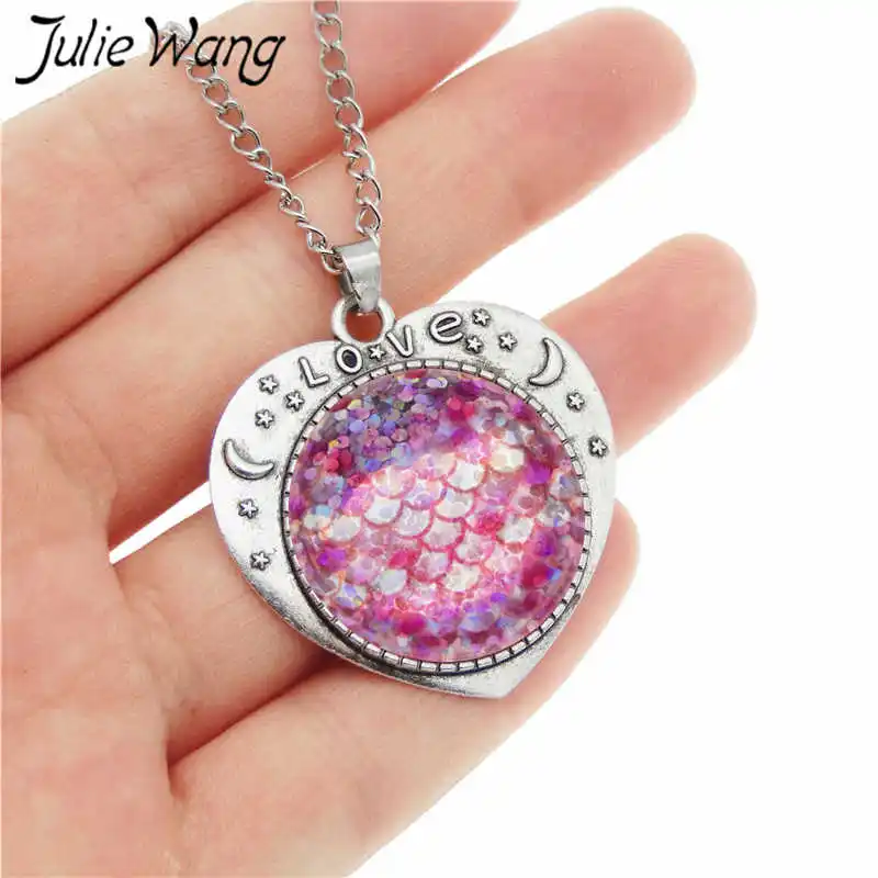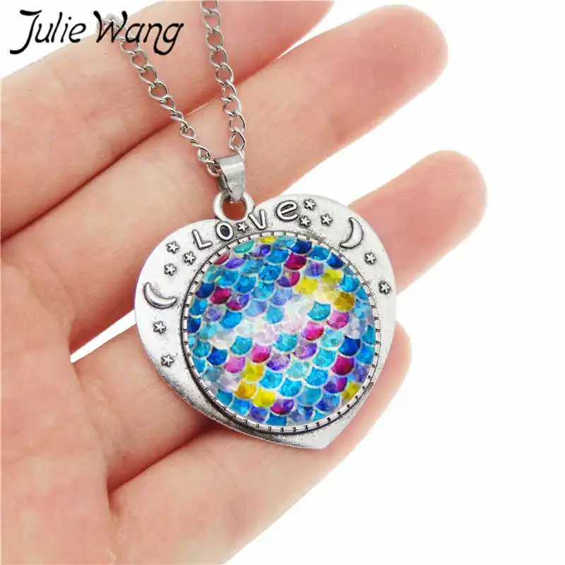 Product Features: 25mm Glass Mermaid Fish Scale Necklace Women Heart Cabochon Setting Pendant Collar Chain Bohemian Fashion Jewelry