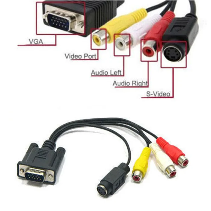 Разъем VGA на одном конце и Оба разъема RCA jack Video (tv) out и S-Video out на другом конце