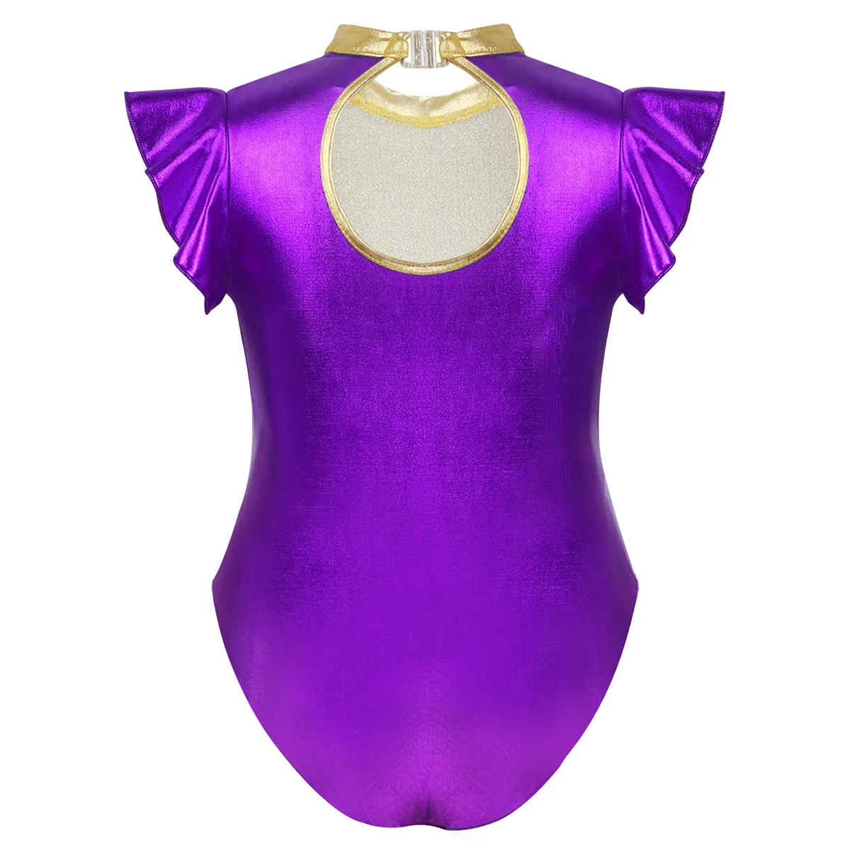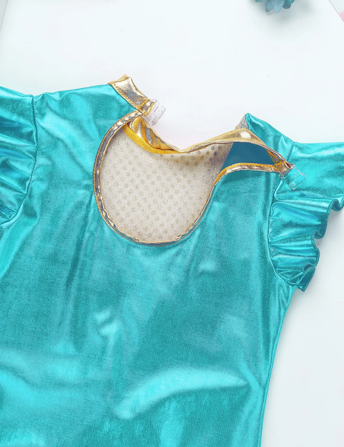Трико с короткими рукавами-крылышками, ложная горловина с застежкой. Металлический верх, лиф спереди, расшитый блестками, с сеткой и золотой отделкой.