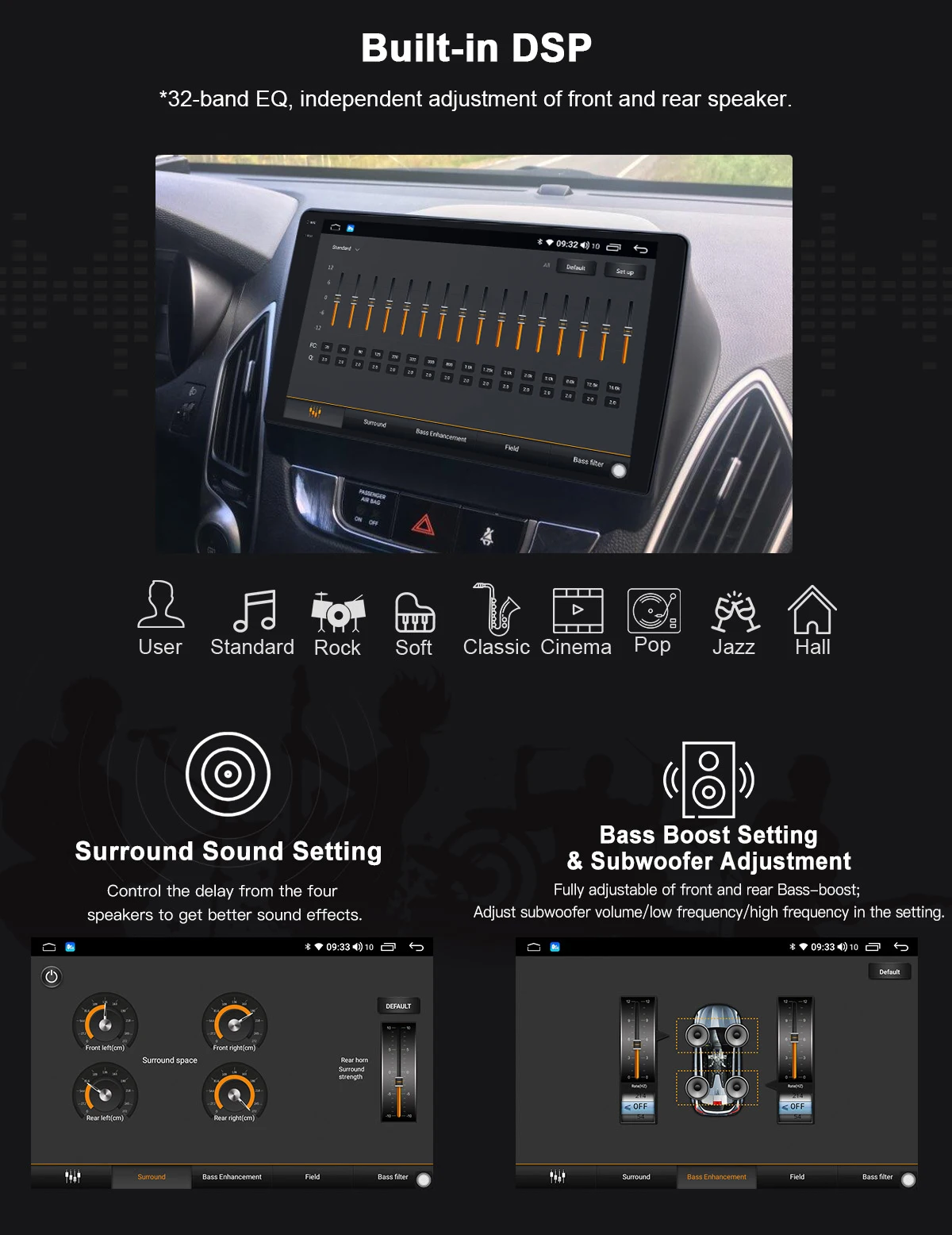 * Мощная система Android 10,0. * CPU:UIS7862 Восьмиядерный 1.8GHz@4.0GB (память) + 64 ГБ (память). * Встроенный Android Auto & Apply Carplay. * Встроенный слот для sim-карты. * Оптический выход и коаксиальный выход. * Встроенный DSP с 32-полосным эквалайзером. * 5 ГГц WIFI обеспечивает высокую скорость загрузки. * Радиочип TDA7786, чип усилителя: TDA 7851.