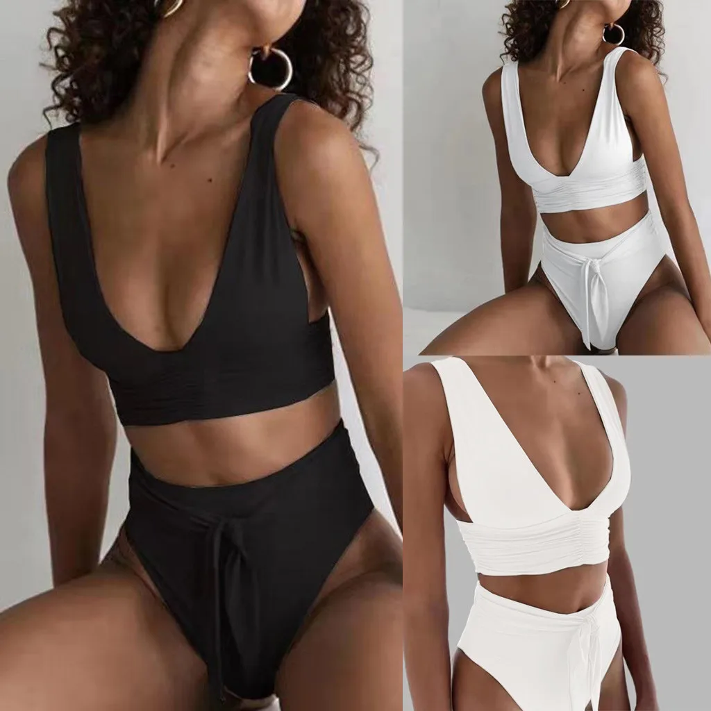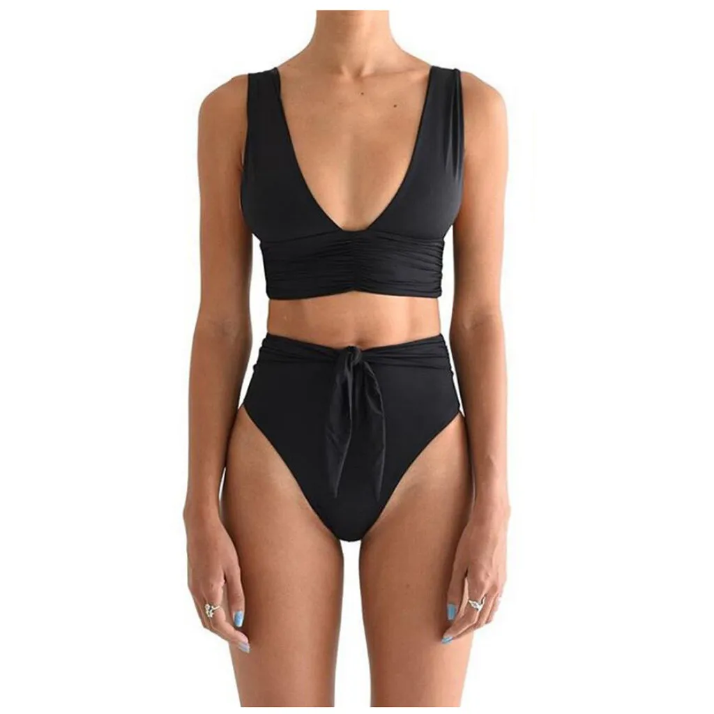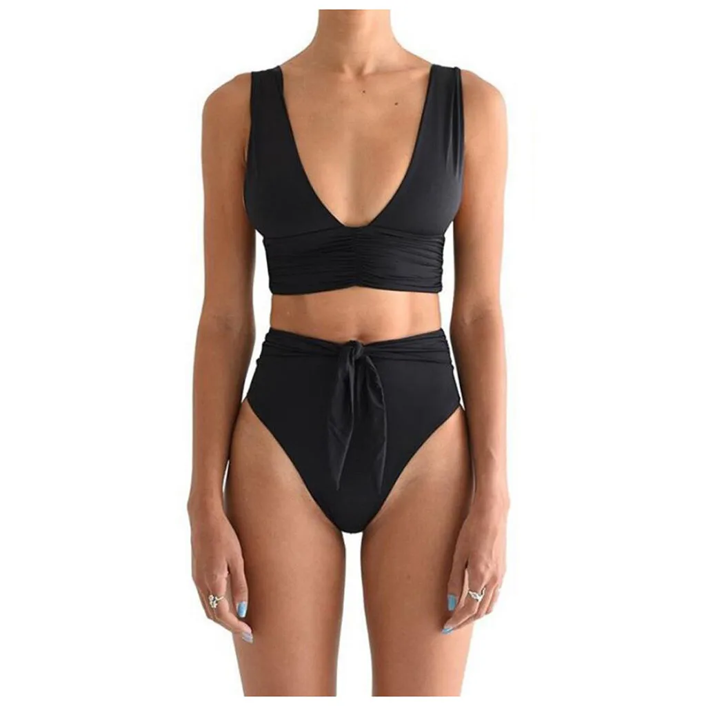 Женский модный однотонный купальник с высокой талией и бантиком, комплект бикини, пляжный костюм
