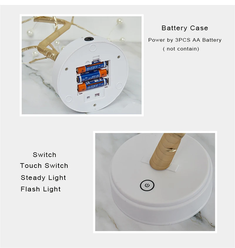 Brand NameLEEDOMEModel NumberCherry Blossom Tree Table LampMaterialPlasticStyleART DECOItem TypeTable LampsTechnicsRotational MoldingPlug TypeNonePower SourceDCApplicationBed RoomVoltage4.5VWattage0-5WCertificationceCertificationROHSBody MaterialABSBody MaterialPlasticLight SourceLED BulbsBase TypeNoneWarranty2YearsIs Bulbs IncludedYesIs DimmableNoBody ColorBlackSwitch TypeTouch On/Off SwitchFinishNoneShade DirectionDownShade TypeShadelessFrame ColorWhiteMeasurement unit100000015Each pack1Led Bulb36LedsLighting ColorWarm WhiteLamp ApplicationFor Home DecorationLamp Power3PCS AA Battery ( not contain)Lamp FeatureRetro Pearl Home Table Lamp