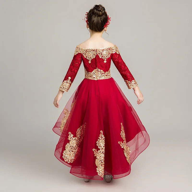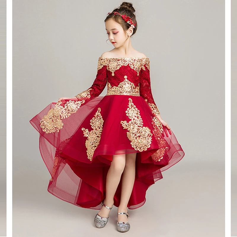 Платья принцессы с длинными рукавами для девочек B072, кружевные платья с открытыми плечами и цветочным узором для девочек на свадьбу, бальное платье из тюля с вырезом лодочкой для девочек