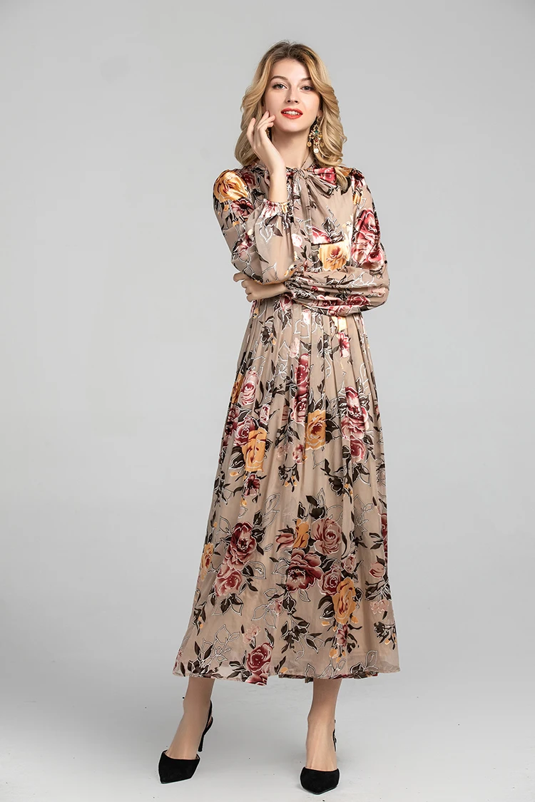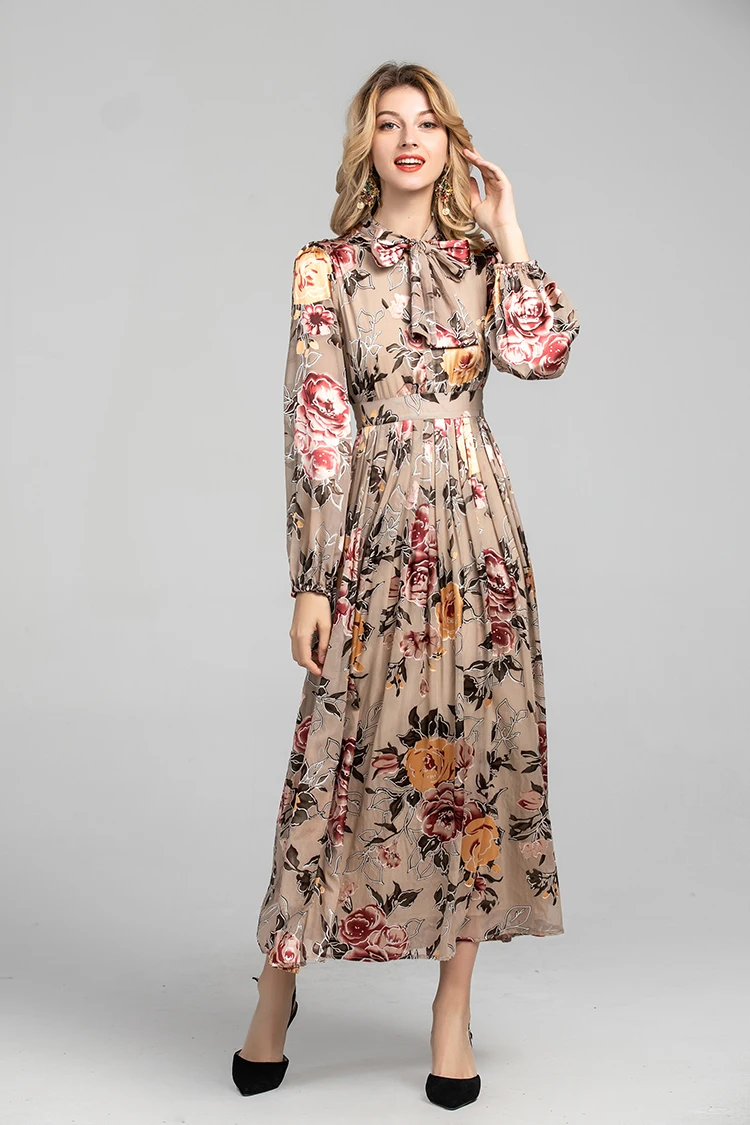VERDEJULIAY, Европейское винтажное платье А-силуэта, женское элегантное платье с воротником-бантом, весна 2020, Подиумные модные блестящие Миди Платья с цветочным принтом