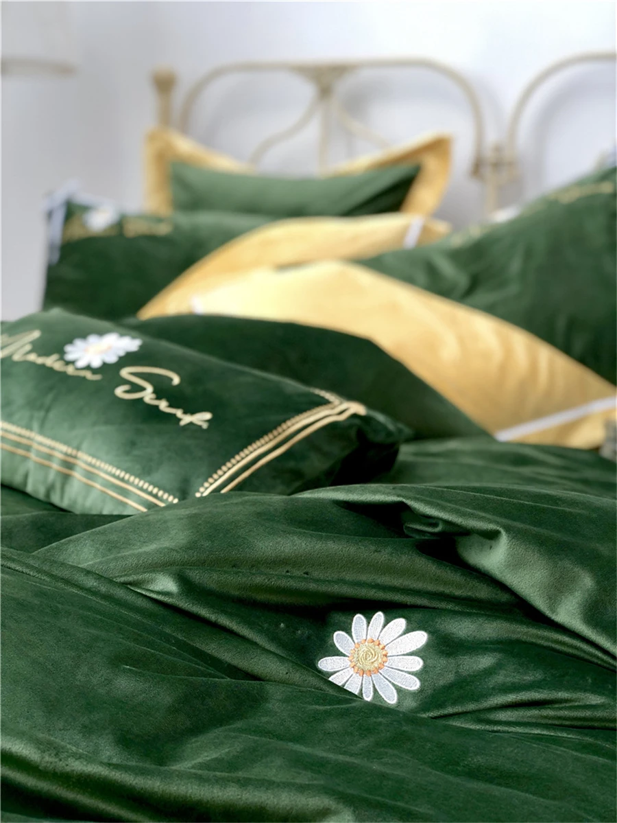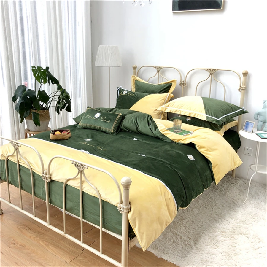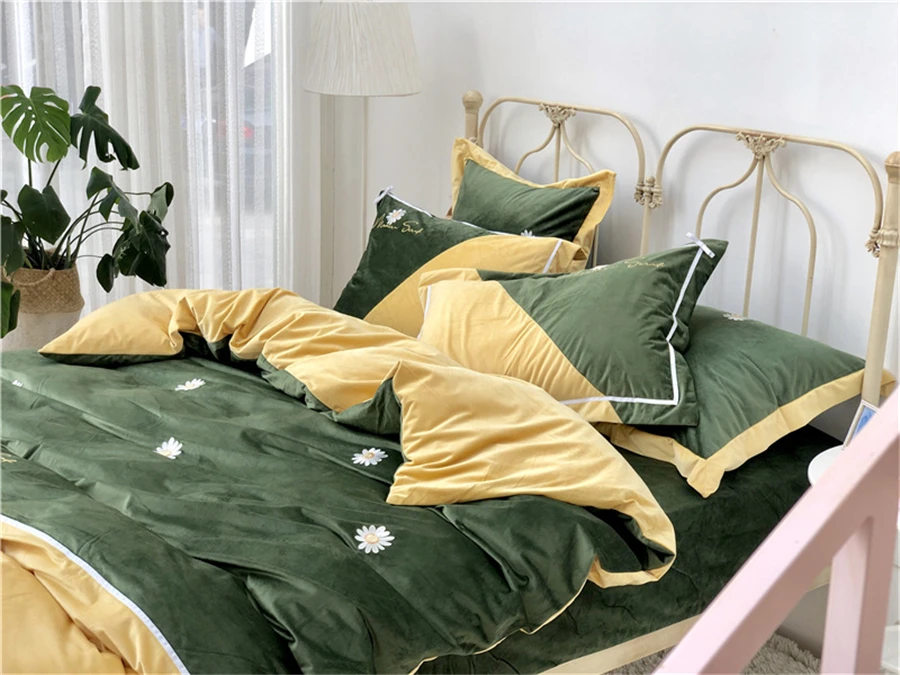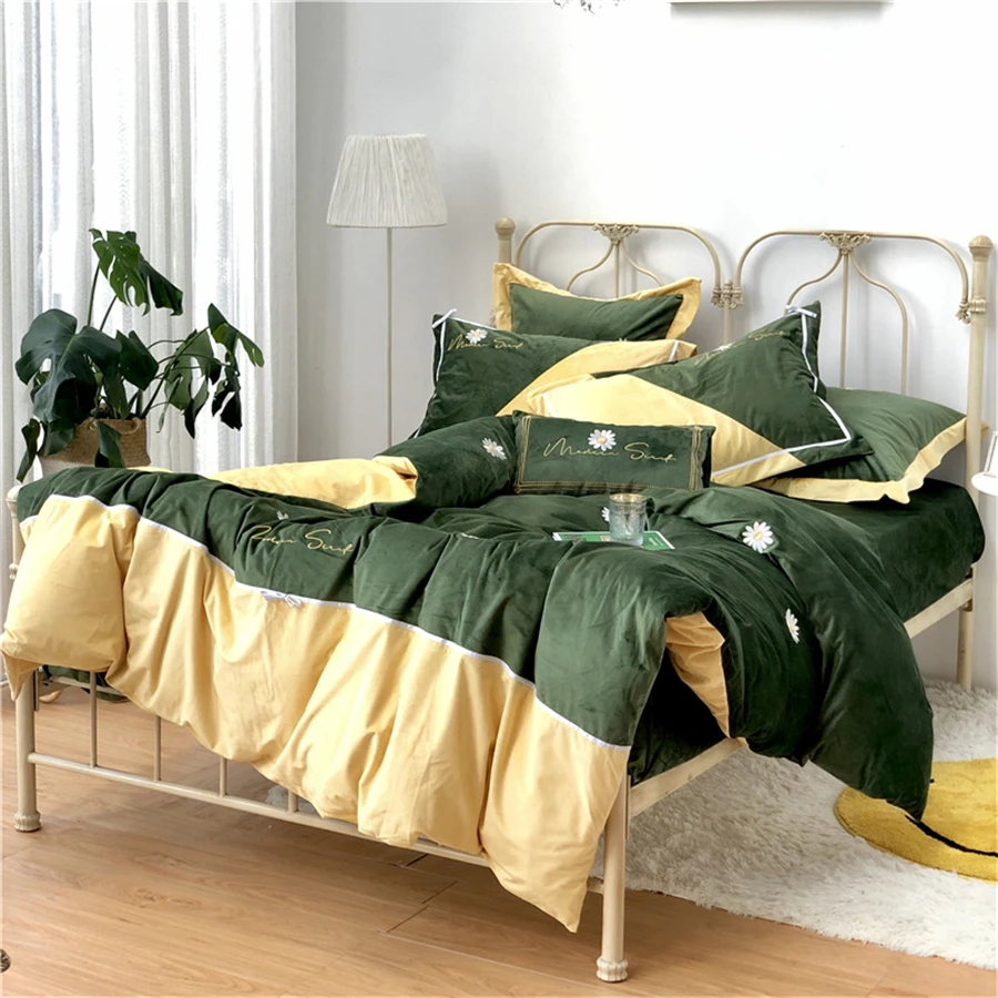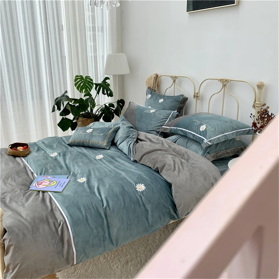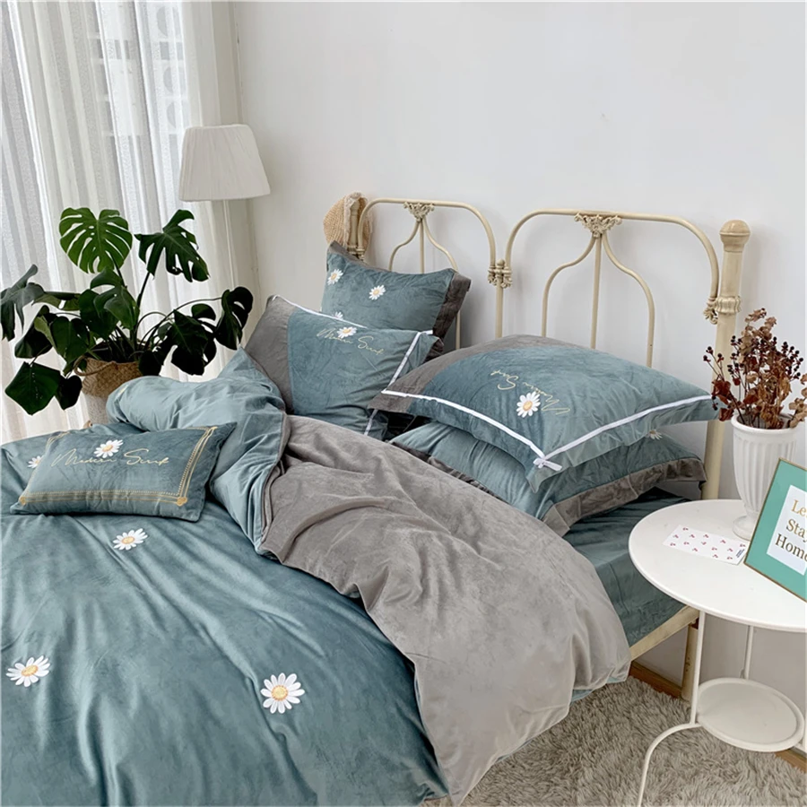 Бархатный теплый комплект постельного белья на осень и зиму, 4 шт., Фланелевое стеганое одеяло с вышивкой ромашки, простыня, наволочка, пододеяльник из флиса в стиле пэчворк