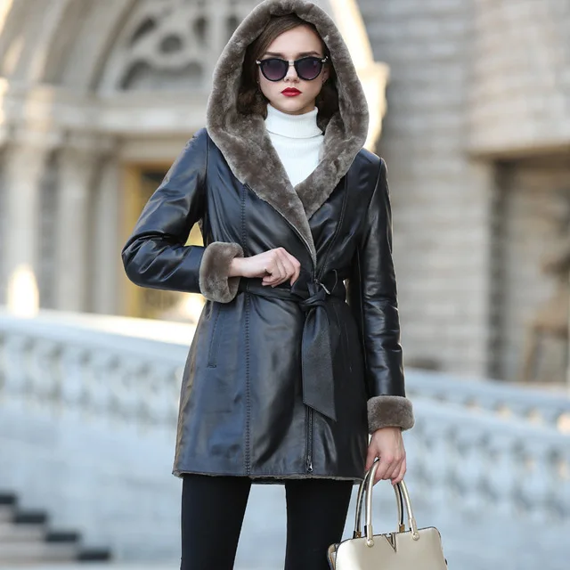 Женская куртка из натуральной кожи, пальто из натурального меха ягненка с капюшоном, тонкая овчина, овчина, черная зимняя теплая Женская куртка размера плюс