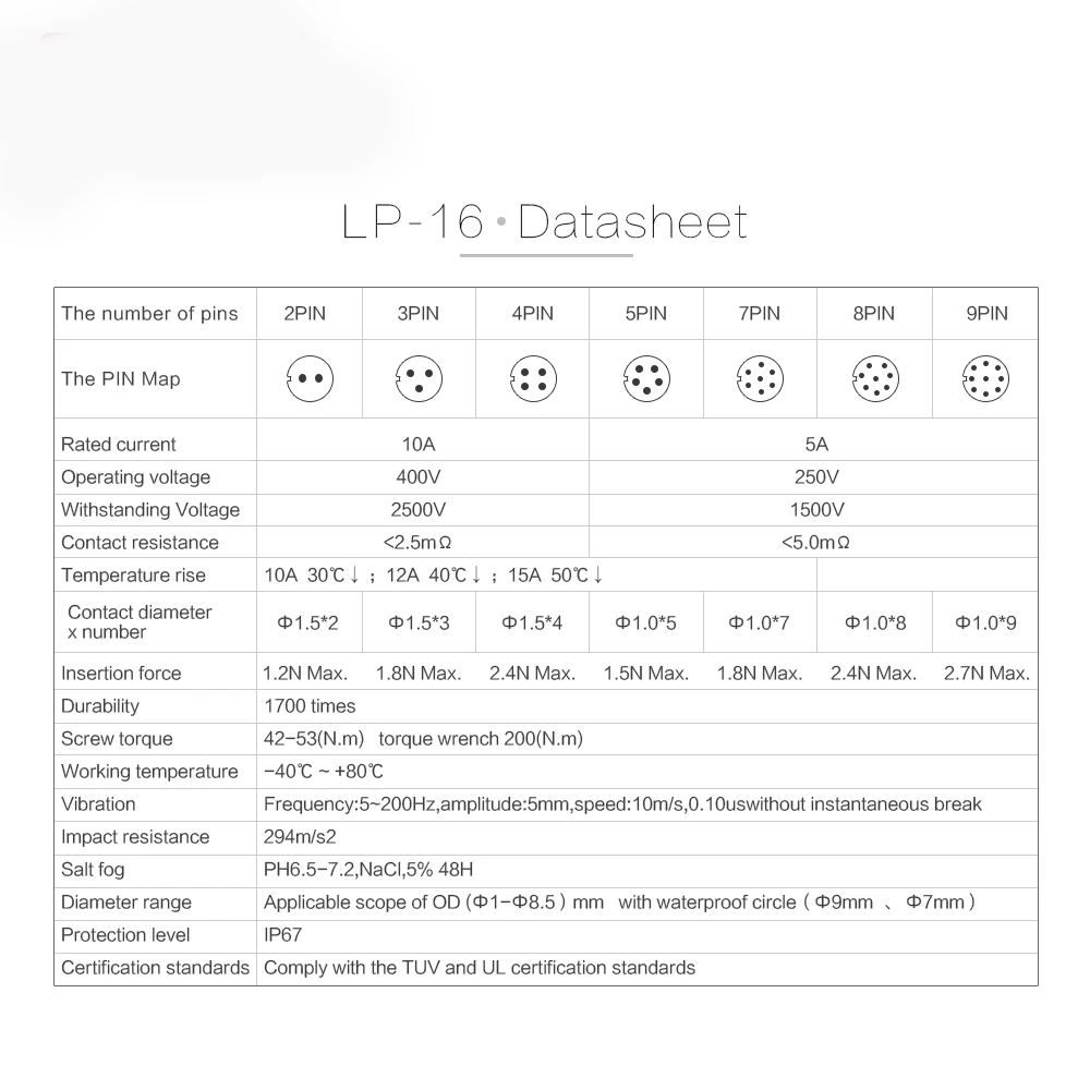 Спецификация s для 2pin, 3pin, 4pin: Кабель Спецификация: 1,0 m ㎡ -- 1,5 m AWG/18-16 AWG диапазон диаметра: Φ3mm ~ Φ7mm диаметр контакта × номер: rated 1.5x2/1.51.5x3/1.51.5x4 Номинальный ток (A): 10A рабочее напряжение (AC.V.rms): 400 В контактное сопротивление <2,5 м Ω повышение температуры: 10 а контактная температура ниже 30 ℃,12 А. ..... 40 ℃⑤, 15a....50 ℃↓ Выдерживает напряжение (A C.V) 1 минута: 2500 В Сопротивление изоляции:> уровень защиты 500MΩ: IP67 Долговечность: ≥ 500 раз Рабочая температура: -40 ℃ ~ 80 ℃ режим подключения: штепсельная вилка и отсоединитель Монтажный провод: корпус припоя, изоляционные детали: высокопроизводительная Инженерная пластмасса оборудование: цинковый сплав (жемчужный твердый хром) медные иглы: медный сплав (Позолоченный 4U) водонепроницаемый круг: силикагель степень воспламеняемости: UL94-V0 Спецификация s для 5pin, 7pin, 8pin, 9pin: характеристики кабеля: 0,15 м ㎡ -- 0,2 м ㎡/26-24 AWG Диаметр диапазон: Φ3mm ~ Φ6mm свяжитесь Диаметр × номер: Φ1.0x5/Φ1.0x7/Φ1.0x8/Φ1.0x9 Номинальный ток (A): рабочее напряжение 5A (AC.V.rms): 250 В контактное сопротивление <5м Ω повышение температуры: 10А контактная температура ниже 30 ℃, 12А. ..... 40 ℃⑤, 15a....50 ℃↓ Выдерживает напряжение (A C.V) 1 минута: 1500 В Сопротивление изоляции:> уровень защиты 500MΩ: IP67 Долговечность: ≥ 500 раз Рабочая температура: -40 ℃ ~ 80 ℃ режим подключения: штепсельная вилка и отсоединитель Монтажный провод: корпус припоя, изоляционные детали: высокопроизводительная Инженерная пластмасса оборудование: цинковый сплав (жемчужный твердый хром) медные иглы: медный сплав (Позолоченный 4U) водонепроницаемый круг: силикагель степень воспламеняемости: UL94-V0