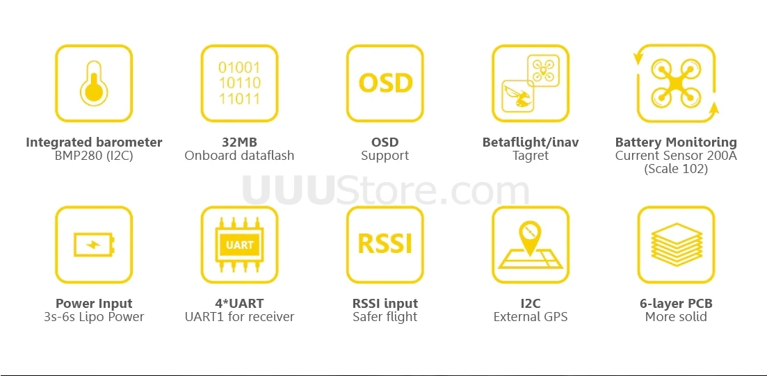 | OSD | Чип BetaFlight OSD w/ AT7456E |