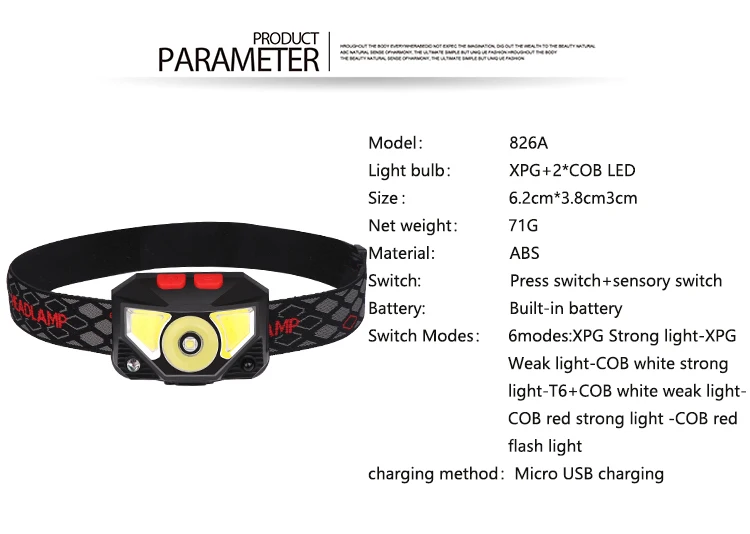 • Brand: PAWEINUO • Model Name: C10(IR sensor, Build-in battery) • Enable transmitter: XPE Q5+ 2* COB • Mode: 6 modes • life: 100,000 hours • Color: Black • Color Light: white light • Lens: Convex Lens • Power: 1 x 18650 battery • Charger: USB charging • Input: ac110 - 220 v 47 - 63 Hz • Output: 3.7 v; 450 mah • Material: Lithium-ion battery • Voltage: 3.7 v