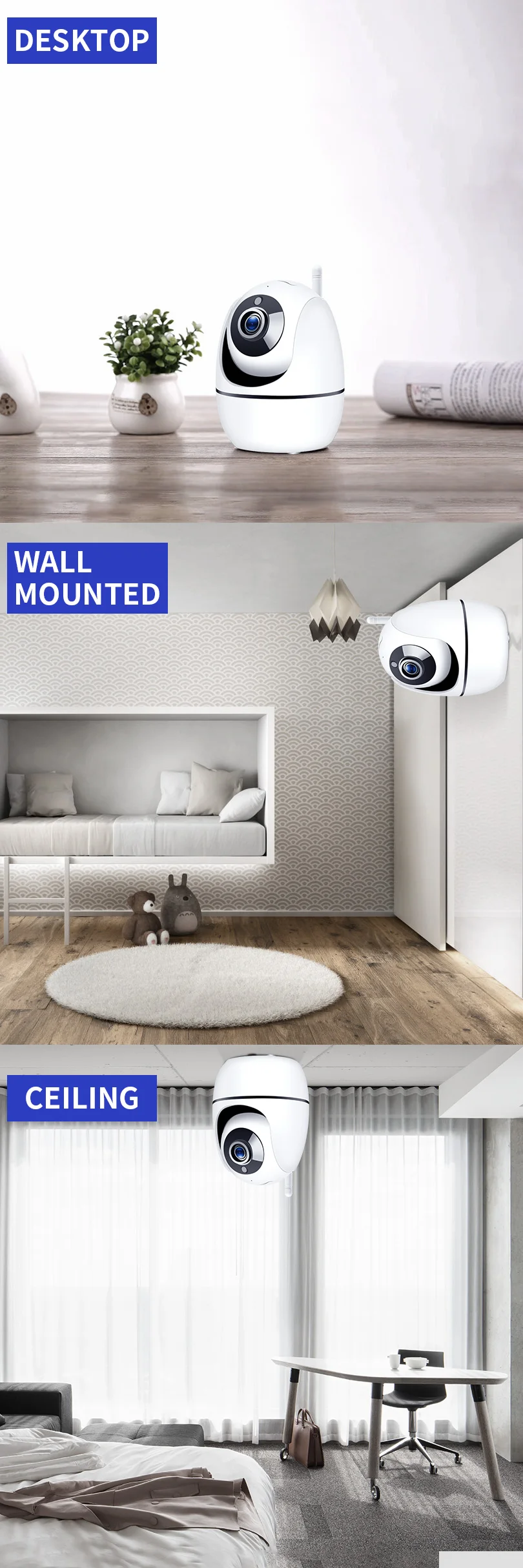 Wall BracketSideNetwork InterfaceWi-Fi/802.11/b/gTypeip cameraTechnologyInfraredBrand NameEBTOPSModel NumberEB-6180PColorWhiteOriginMainland Chinais_customizedNoCertificationCEInstallationNormalStyleDome CameraSensor BrandSmartSensHigh Definition1080P(Full-HD)Megapixels2MPConnectivityWIFILens (mm)3.6mmViewing Angle 360°IR Distance(m)10Video Compression FormatH.265Supported Mobile SystemsAndroidSupported Mobile SystemsIOSSupported Operating SystemsWindows 7Supported Operating SystemsMac OSSupported Operating SystemsWindows 10Power Supply(V)DC 5VTF CardNoneMeasurement unitpiece/piecesEach pack1