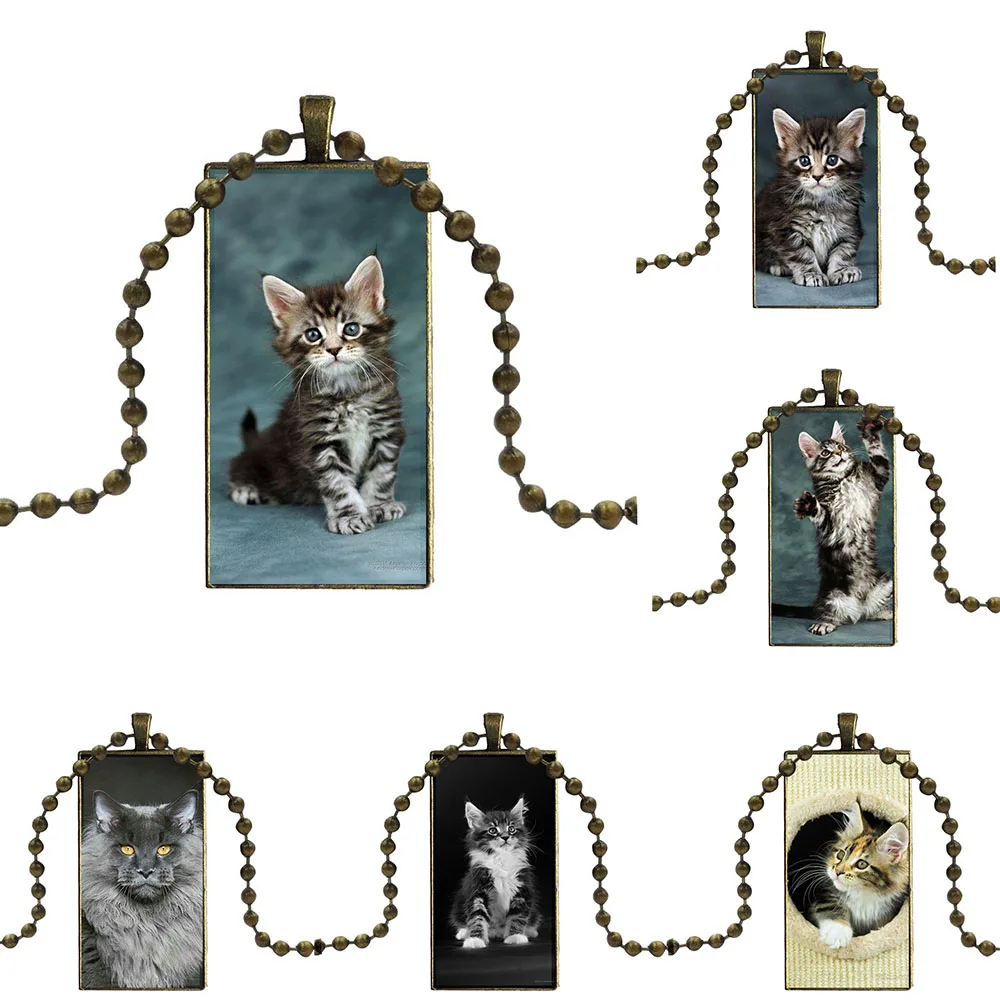 Женское винтажное дизайнерское серебряное ожерелье с изображением кота Мейн-кун, модное винтажное прямоугольное ожерелье с подвесками