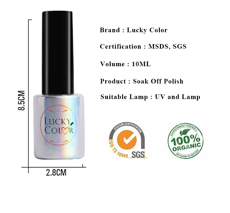 Бренд: LUCKY COLOR Тип: отмачиваемый Гель-лак Объем: 10 мл Цвет: 12 цветов Сушка: УФ/светодиодная лампа Инструкция: -1. Используйте Базовое покрытие и сушите с УФ-лампой -2. Нанесите цветной гель и высушите УФ-лампой -3. Используйте верхнее пальто, сушите УФ лампой и, наконец, завершите Для удаления: -1. Замочите ногти в акриловом средстве для снятия лака примерно на 5 минут. -2. Осторожно снимите покрытие с каждого ногтя. Осторожно! 1. Объем составляет 10 мл. Поскольку емкость бутылки составляет более 10 мл, гель для ногтей не будет полностью заполнен бутылкой! 2.Храните плотно закрытым. Хранить вдали от солнечного света. Хранить в недоступном для детей месте