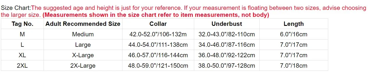 | Tag No. | Adult Recommended Size | Collar | Underbust | Length |