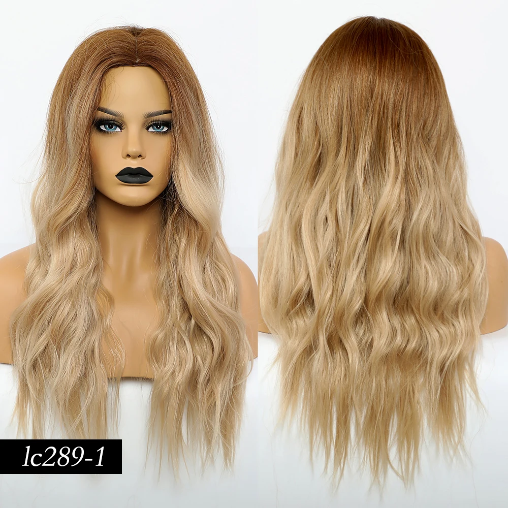 Element Heat Resistant Fiber Synthetic Long Water Wave Ombre Brown to Golden Blonde Wigs with Bangs for White/Black Women