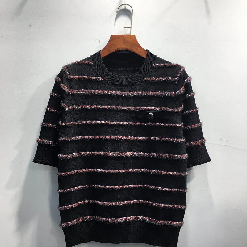 Брендовый дизайн, летний женский роскошный трикотажный топ в полоску золотистого цвета с коротким рукавом и круглым вырезом розового и красного цвета свободного размера плюс, футболка, одежда 2020