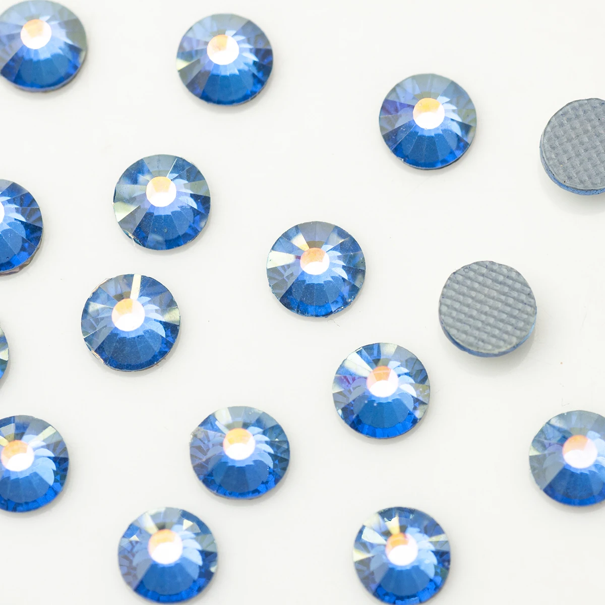 Цвет светильник-сапфировый AB Размеры: SS6 SS8 SS10 SS16 SS20 SS30 Форма: плоские стразы серого клея Используется как: одежда, обувь, сумки свадебное платье